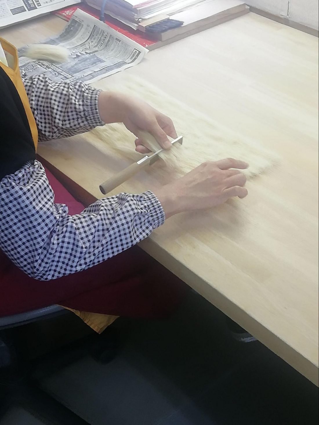 So beginning the actual experience, I was walked through the process step-by-step. Beginning with station one, the winnowing, sorting and confirmation of the hair. From a massive collection of one particular animal hair, it is one worker’s job to assure that all the hairs are a uniform length, have a relatively uniform feel (occasionally there are hairs coarser or softer than the others), and are not clumped or fused in any way. It’s a careful feeling out and combing process that must be done with a high regard for quality. As I was to learn, none of the steps can be done half-heartedly or haphazardly. Quality is the top priority, and every step is therefore painstakingly done with that in mind. This is not the job for a casual part-timer at all.