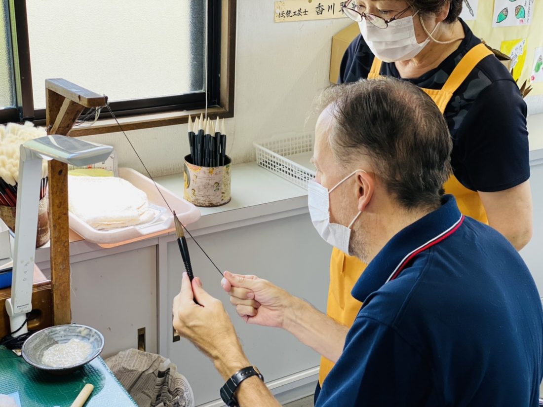 After the glue is set in, it is time to hold the brush just so, and use a comb to cull out any of the hairs that didn’t take. This is done using a combination of a comb and finger, sandwiching the brush as you gently turn your handle to work all around and be sure all of the excess hair is gone, and to begin working the shape of your brush tip. When it seems ready, the final step was quite a surprise to me. It is simply a piece of string hanging down from a bar. Nothing more technological or sophisticated or modern than that. A string. The trick here is to dab some glue near the tip with your fingers, then wrap the string around the brush tip with your right hand. When ready you slowly pull down with your left, keeping the string taut with your right. The result is the removal of all excess glue and also a perfect tip for your brush. So simple, yet elegant – and a little daunting. Explanation and demonstration finished, it was now my turn to show that I had learned something.