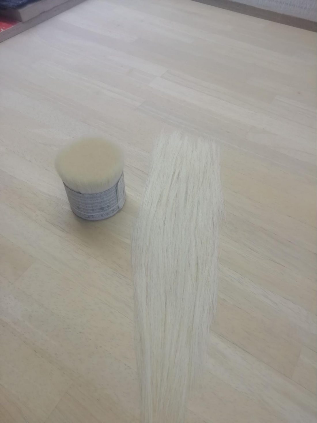 Did I say “hair”? Yes. Yes, I did. The next thing I learned was that I was also wrong in assuming these brushes were made with some kind of synthetic fiber. Every brush produced by Houkodou (and I imagine all the brush companies in Hiroshima) uses animal hair. No, I cannot be more specific. Apparently just about any kind of animal hair can be used, each with their own characteristics, and producing different styles of brushes. So, name a common animal. There is likely a brush made with its hair. In fact, that was one of my favorite moments of my tour and experience, seeing the row of animal hairs on display, and seeing the wild variety of textures that are indeed presented by these differing hairs. On the shelf I observed: dog, cat, horse, mouse, rabbit, and deer; a bit more surprisingly, squirrel, badger, weasel, pig, wild boar and raccoon dog; and exotically, swan and ox ears! It was fascinating to see the differences. By the way, the staff wishes me to assure any readers, “No animal is harmed in any way during the retrieval of hair, and certainly never killed.” Be at ease, animal lovers.