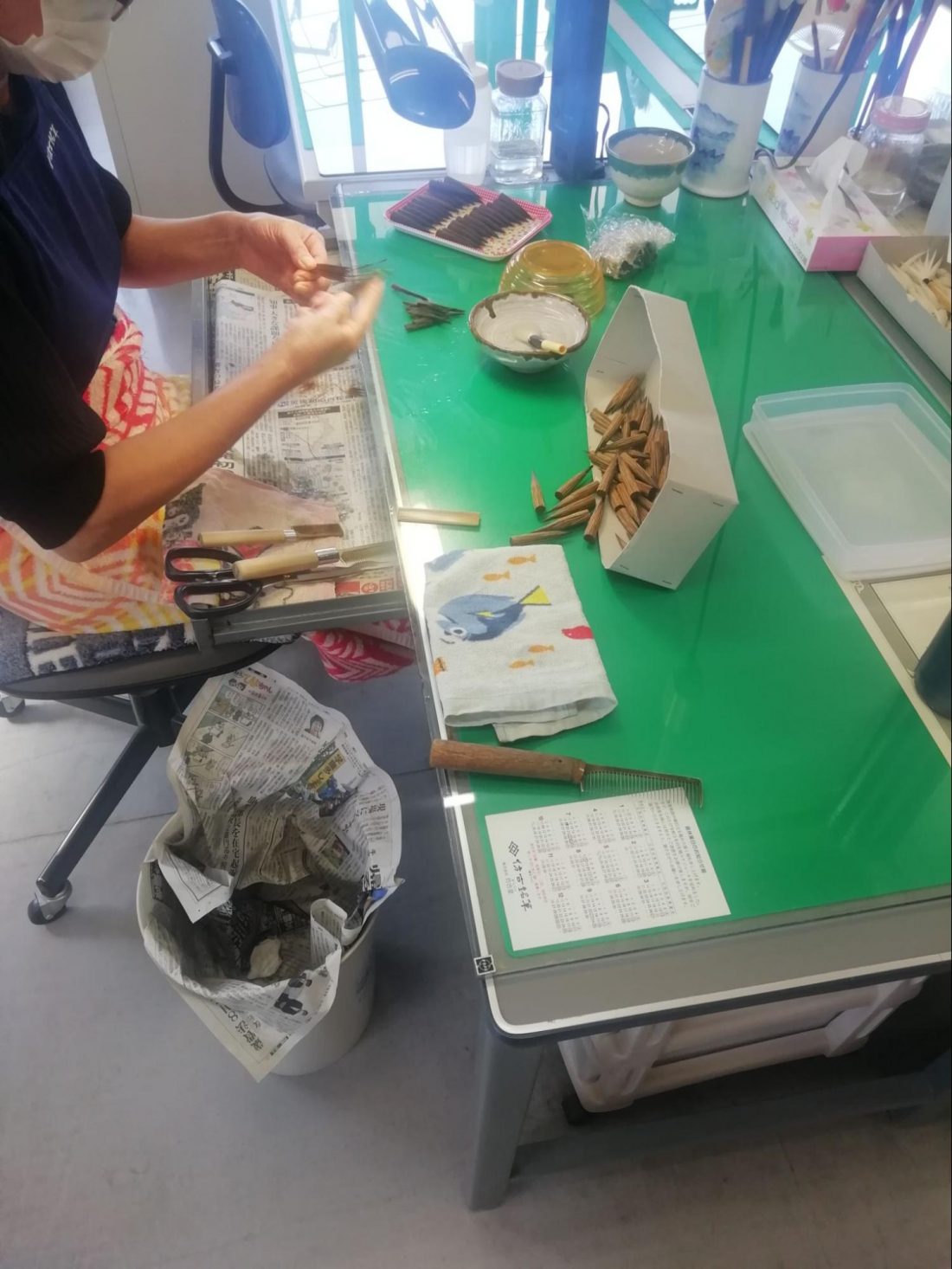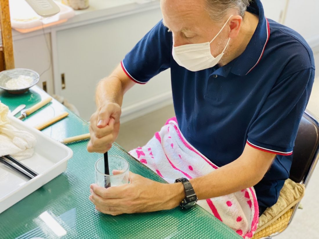 That level of a master craftsman observing me was a little nerve-wracking, but she was as gentle and encouraging as I could hope, and full of praise, warranted or not, and without criticism. It was actually quite delightful to prepare my brush under her guidance. I pounded my brush, having my grip adjusted to the right way, made the correct squishing sound in the glue it seems. Then I combed it out, being told my technique with comb and finger was good, and that I followed instructions well. My brush began to take shape and my pleasure grew. Then it was time for the string. Surprisingly more difficult than I expected I had my string wrapped a bit too low or much around the base. By the time I had got the technique going and pulled the brush through the string just right, I ran out of string before getting completely to the tip of my brush. Oops. With a gentle laugh Takeda-sensei had me start again, showing me how to wrap the string a bit more precisely. This time I pulled it through perfectly and had my correctly finished and uniquely personal brush, complete with name on the handle. Tiny string loop on the top end of it made it perfect for becoming a wall decoration, hanging next to my desk now as I write this. A truly unique experience.