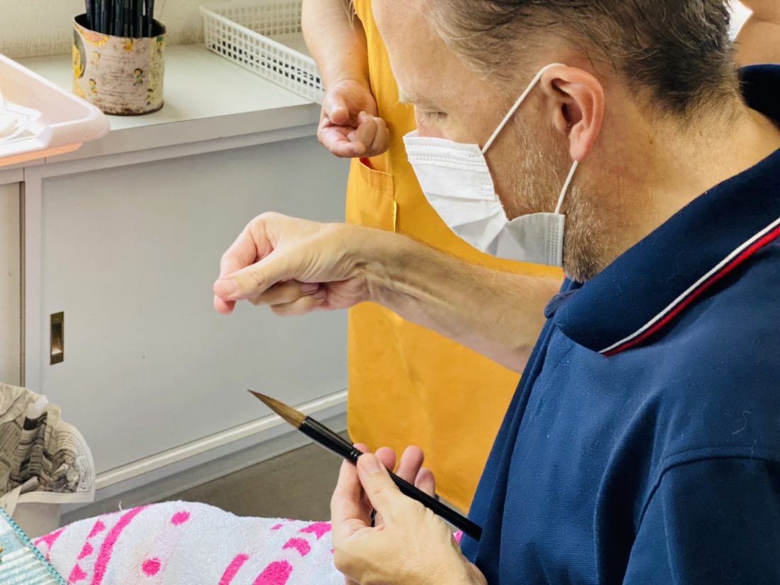 They told me I was ready. They told me my brush was ready. Then they completely and totally unexpectedly pulled out a brush with my own name on the handle, pre-prepared. I was a bit stunned at the generosity, not expecting whatever brush I did to become a permanent keepsake to display in my house. I was quite touched. (A joy not lessened to know that this is done for all those doing the experience. Others might know in advance. I hadn’t. So I loved it.)