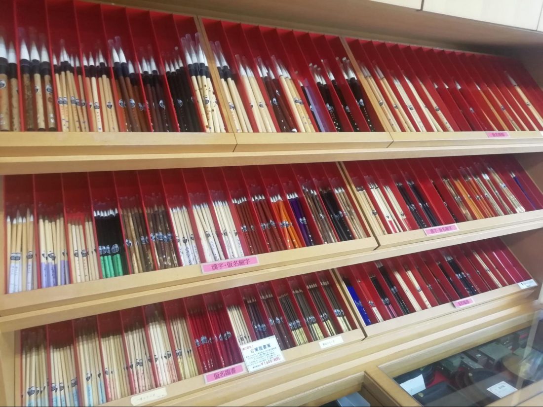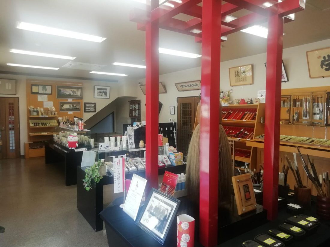 First, an impression of walking into the shop space on the first floor. I’m not a calligrapher, so I was rather blown away by the number of brushes on display, and primarily by the fact that there were so many different sizes and styles presented. Going back to me being naïve, when I think of calligraphers at work, or see pictures of artists working on a canvas, I always just kind of assume the brush they are holding is the one and only brush they used to create their entire work. That notion was allayed quickly in this shop, and I can begin to see that artists are probably hoping for exactly the right size brush for the strokes they are making and the detail they are looking for. I was to learn here at Houkodou that it’s the texture of the brush that matters as well. In other words, the type of hair used to make the brush makes a difference in the outcome of the stroke as well. So this great variety of brushes on display is exactly what true artists are looking for. Just one of many things I was about to learn.