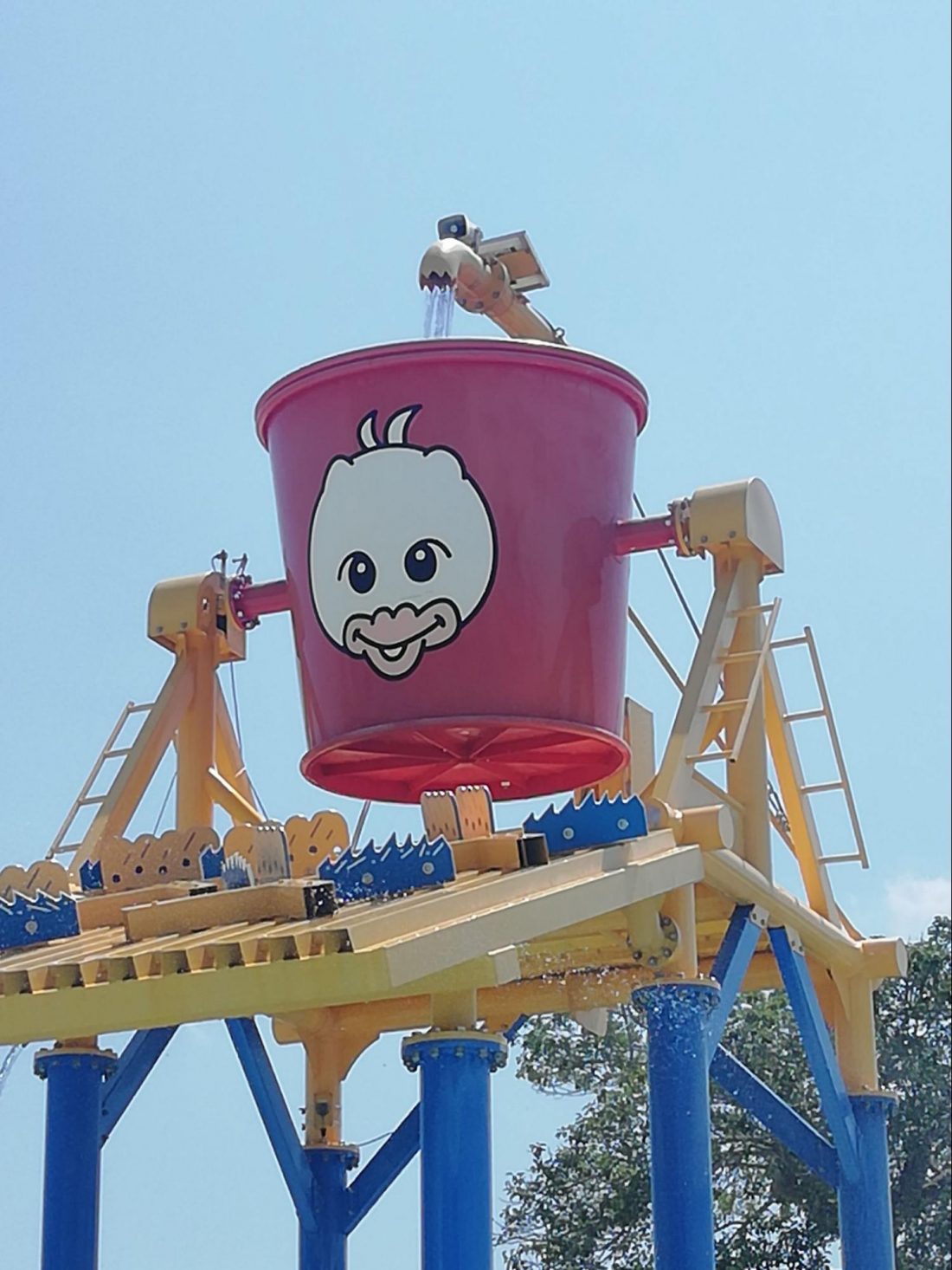 Undoubtedly over the years, the favorite attraction of my children, both before and after they could go on the water slides, is the “Bikkuri Bucket”, or Surprise Bucket. Technically part of the “Kids Pool”, the Surprise Bucket is a large bucket on top of a play structure at the edge of the Kids Pool. Designed so that water is pulled up and dropped into it, when the amount of water reaches a tipping point, it dumps its entire contents creating an instant waterfall. Beautifully set up so that music begins playing just before it tips, people rush to gather under the drop point and get the thrill of having what feels like Niagara Falls drop on you in an instant. Any number of times my children would simply be walking by, recognize it was near the tipping point, and rush to get into place and get splashed, before then continuing to wherever they had been headed. It’s quite a clever attraction.