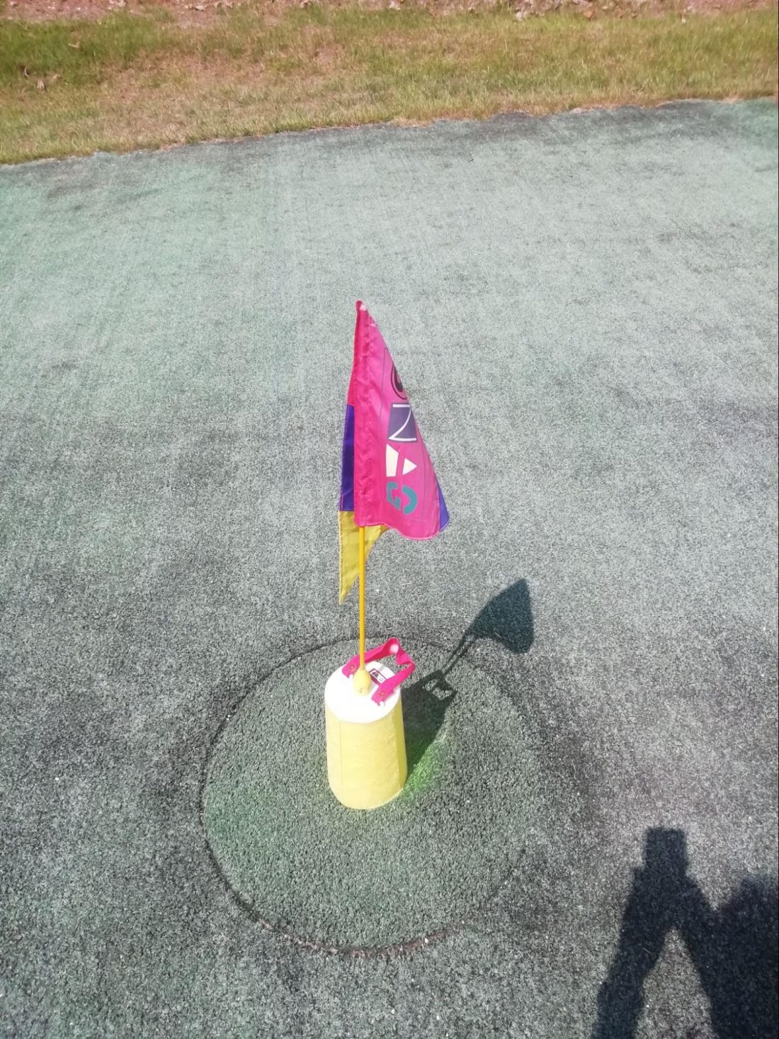 The game is played with just two clubs, the launcher and the roller. Easily understood, the launcher is for your tee shots, and any additional shots you need to get to the “green”. The green itself, often simply a mat of some kind depending on location, here is closer to actual greens, being a designed sodded area with the sodding trays left in place to keep it an even surface. It is that surface that allows the “roller” to help you putt toward the hole. The holes, as stated above, are in fact cones wrapped in Velcro for your ball to stick to.
