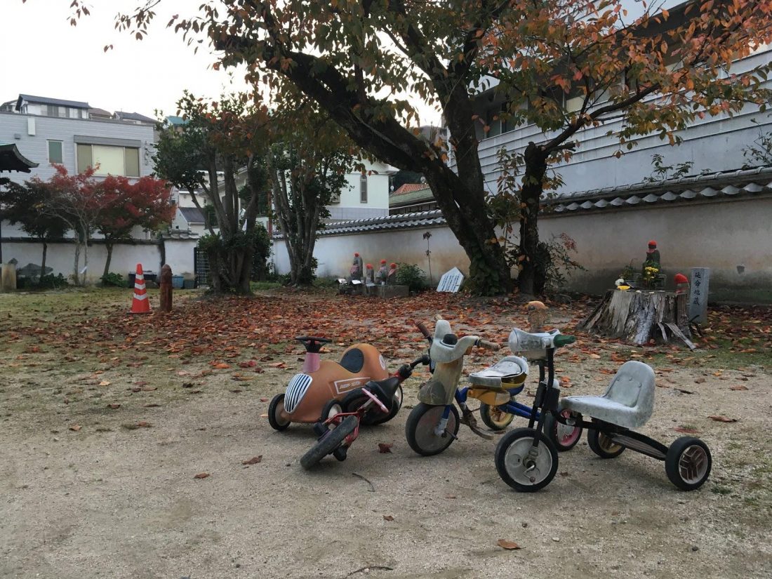 The ground has a large gravel open space and a small collection of kid’s bikes, which you can use freely. There is enough space for kids to have a ride or run around. The temple grounds are walled, so is an ideal environment to let your small children have a safe play around.