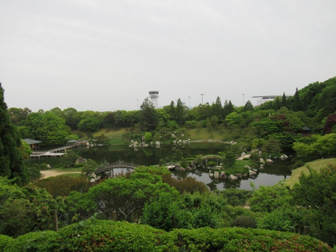 Outside the enormous central pond by the front door, Sankeien is dominated by a labyrinth of interconnected paths, some with slopes and others with stairs, to let the viewer appreciate the garden from a variety of angles and differing heights. Since I have the natural tendency to explore every nook and cranny of these gardens even when the paths loop back around, I spent the rest of the afternoon hiking up and down every road Sankeien offered. It was close to closing time when I stopped at Kangetsutei, a quaint tea house-like structure up on a hill, overlooking the rest of the garden and allowing me to see the final type of scenery: the aeronautic aspect. I had a visual of HIJ’s control tower and part of the terminal building, and if I had timed things right, I could’ve also caught a glimpse of an airplane taking off or landing. It was tempting to pop a squat inside Kangetsutei and start munching on my Hattendo delicacies while staring out at the water, land, and sky, but Sankeien forbids eating and drinking anywhere in the facility, so I decided to be a good citizen and wait for a better time.