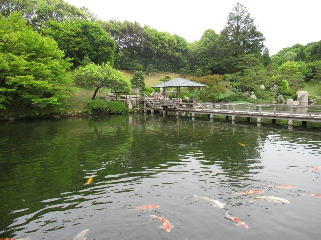 I returned to the front entrance of Sankeien, flashing my ticket to enter again. The name Sankeien in Japanese (三景園) translates to “three scene garden,” an apt moniker for what I saw in this garden today as there were indeed many views to be relished at Sankeien that I would roughly divide into three categories: botanic, aquatic, and aeronautic. The first scene visitors will encounter after going past the front door will most likely be the aquatic component. Simply look down into the water and you’ll be greeted by some ravenous carp gazing up at you, hoping you bought a bag of feed for sale at the gift shop. I didn’t need to buy any fish food to catch their shenanigans; watching others feed the carp was enough entertainment for me. Wherever in the pond the food is thrown is where all the fish in the vicinity reconvene, and flinging pellets in multiple areas results in a pluricentric piscine pig-out!
