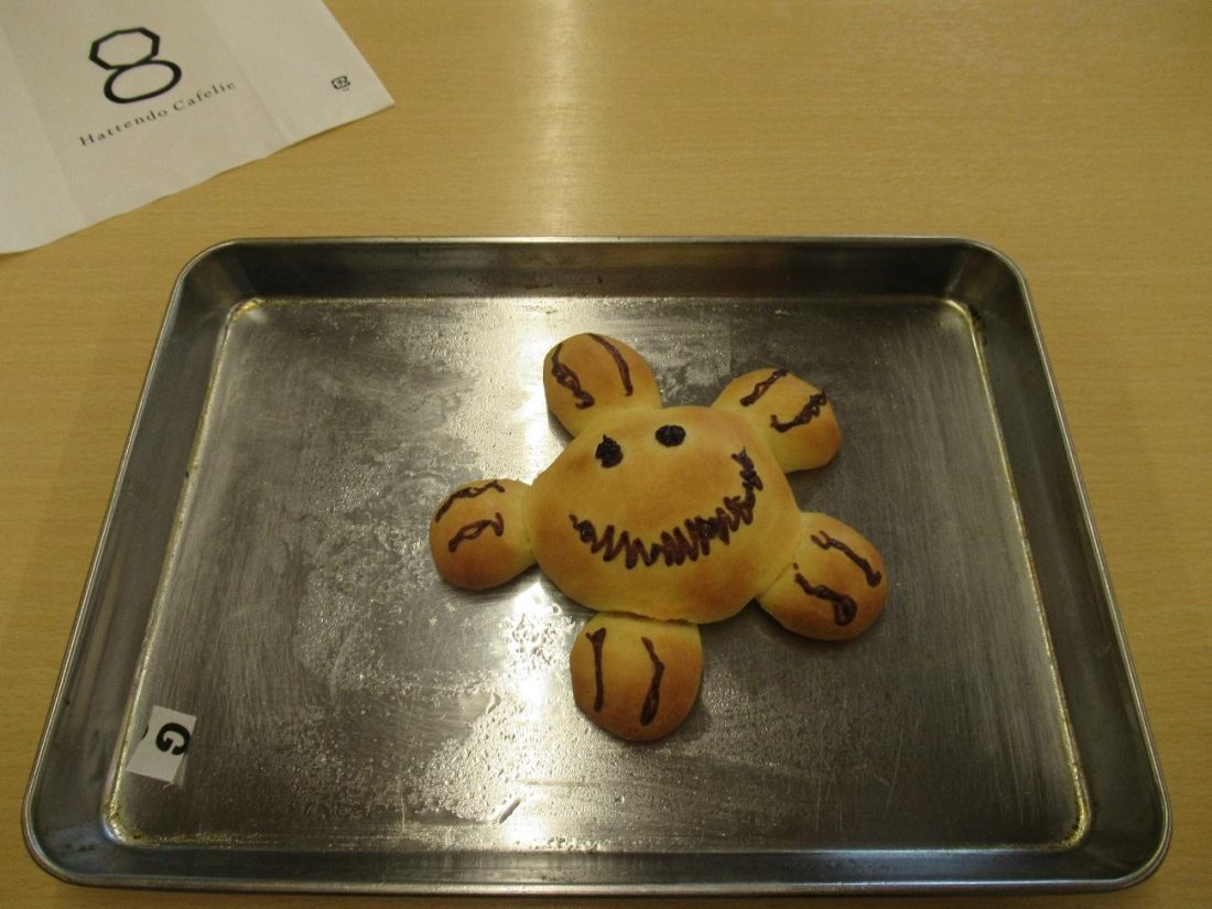 The first step in kneading the dough is to press down on it with the side of one’s hand, using a karate chop-like motion to cut pieces off of the dough. Second, bend the fingers and thumb of one hand to make a “cat paw” and roll the pieces into smaller balls. The third phase involves sticking the little dough balls back together, which is easier done if one end of each ball is stretched out just a little bit. Be sure to keep in mind the shape of your desired product; for instance, since I wanted to make a flower shape, I cut off five small balls to be turned into petals. Finally, use the chocolate icing pen to draw a design onto the bread and hand it to the instructor, who will bake it in the back kitchen. My chocolate icing flower bun turned out like this!