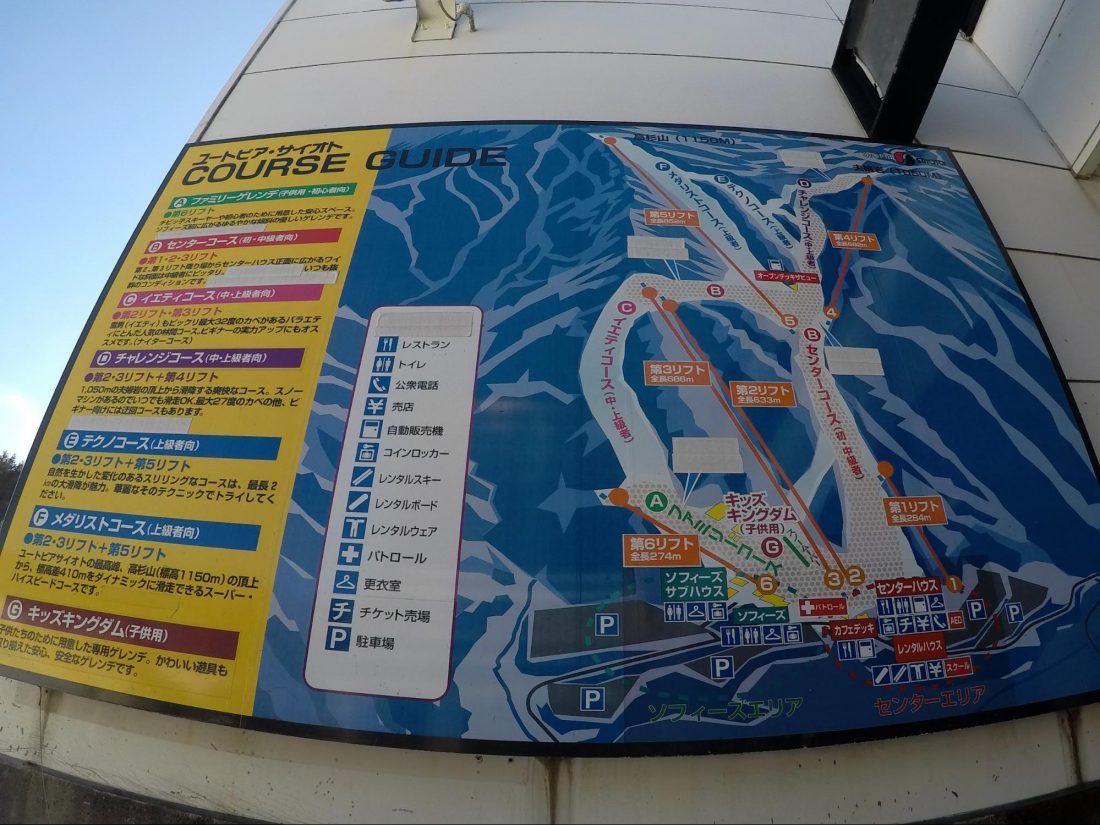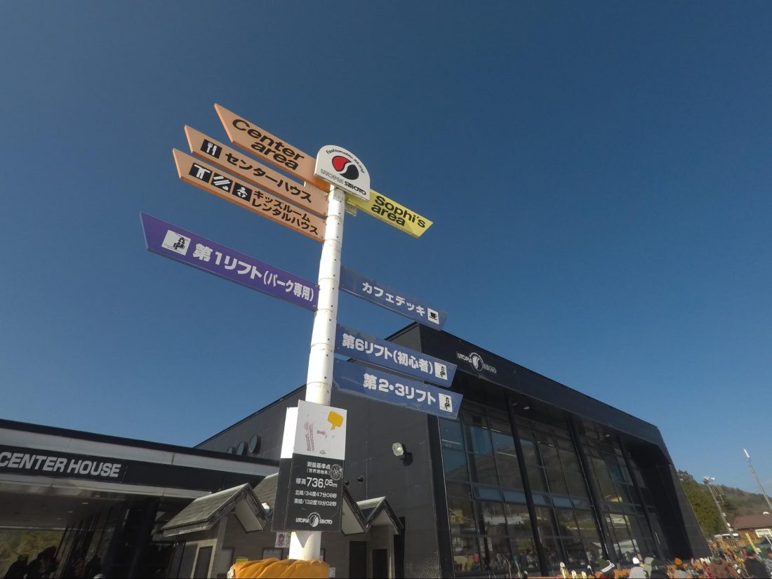 Utopia Saioto is in the northern part of Hiroshima in the Yamagata district. They open at 8 in the morning and close at 5 or 6 in the evening. They sometimes have an overnight time for those who want to go snowboarding or skiing at night with much fewer people down the courses.