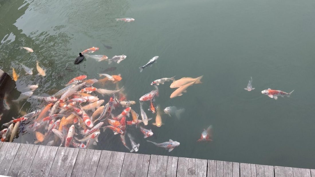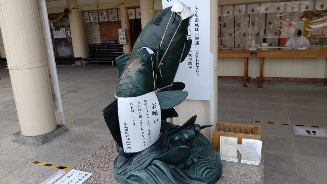 There are countless Shinto shrines in Hiroshima of all sizes but Gokoku Shrine is one of the largest and most popular. It is famous for receiving huge numbers of visitors for 初詣 “hatsumode”, first shrine visit of the new year. In Japan, it is a common tradition to go to shrines or Buddhist temples at some point in early January, if not on New Year’s Day itself, to pray for a good year. The Gokoku Shrine hosts many festivals all year round that attract a lot of visitors, and it is also well known for its “lucky carp”. Hiroshima Castle’s moat is filled with carp and Hiroshima’s baseball team is called, The Carp. The Carp players actually come to Gokoku Shrine at the beginning of every baseball season to pray for a good season. As a result, the Shrine sells little, carp trinkets and carp good luck charms. There are two carp stone statues standing on either end of the Shrine’s main structure. The statue on the right side of the Shrine is alone and it symbolizes moving forward independently. The statue on the left side of the Shrine has two carp and it symbolizes teamwork and overcoming obstacles together.
