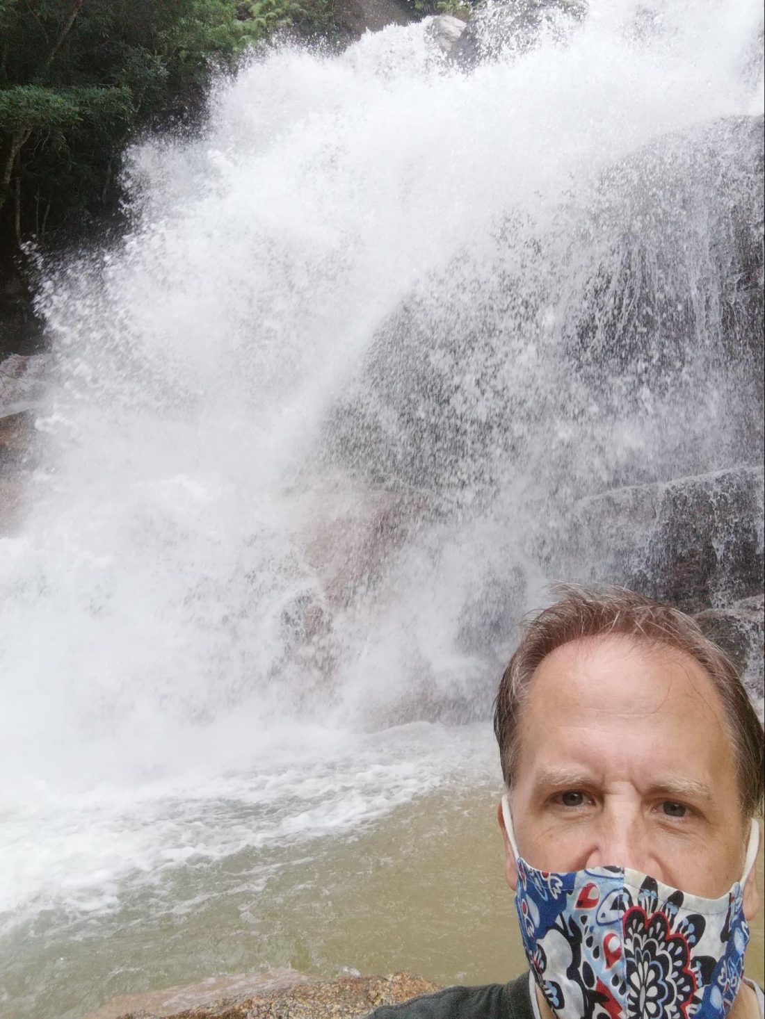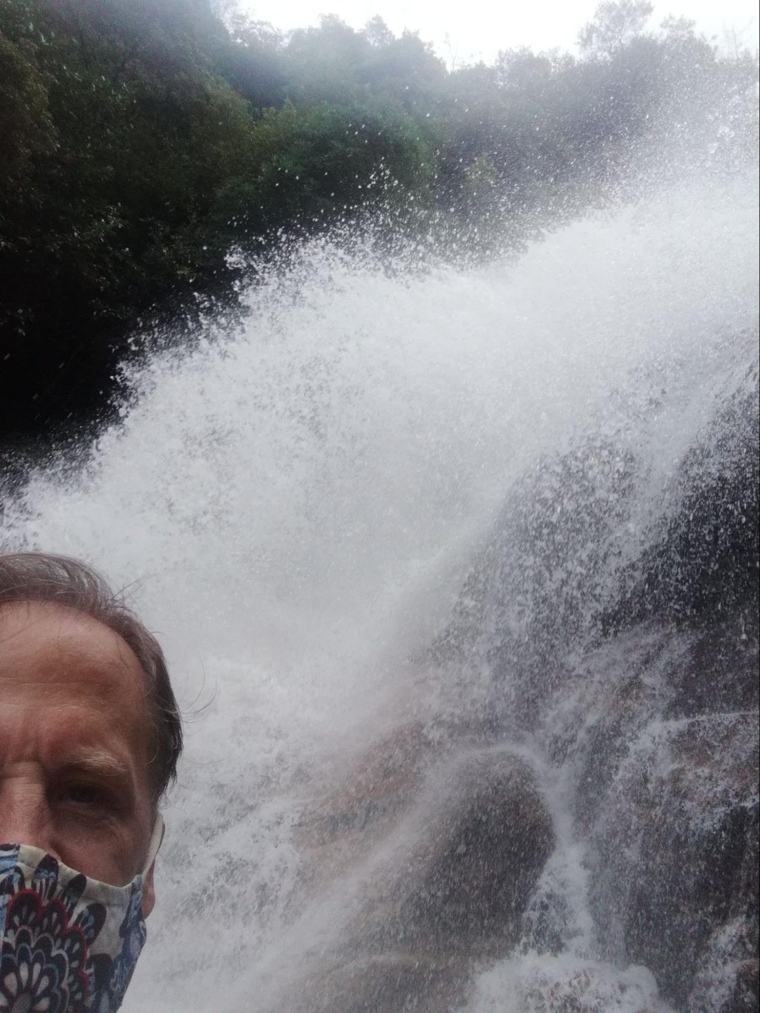 Yep, I waded back to secure my phone, took off my watch, checked for anything else that needed to be protected, and then waded back. And this time I didn’t stop just before. With Ondaki shouted out to me in his loudest voice, I walked straight under, and then turned and just stood there with my arms out feeling the cold, cold falls come right down on me. I really wish I had asked someone to record the moment on my phone for me, but as it is, that image will be in my heart for a long time. I settled for a post-immersion selfie for proof. Moment of Joy, indeed! It was fantastic!