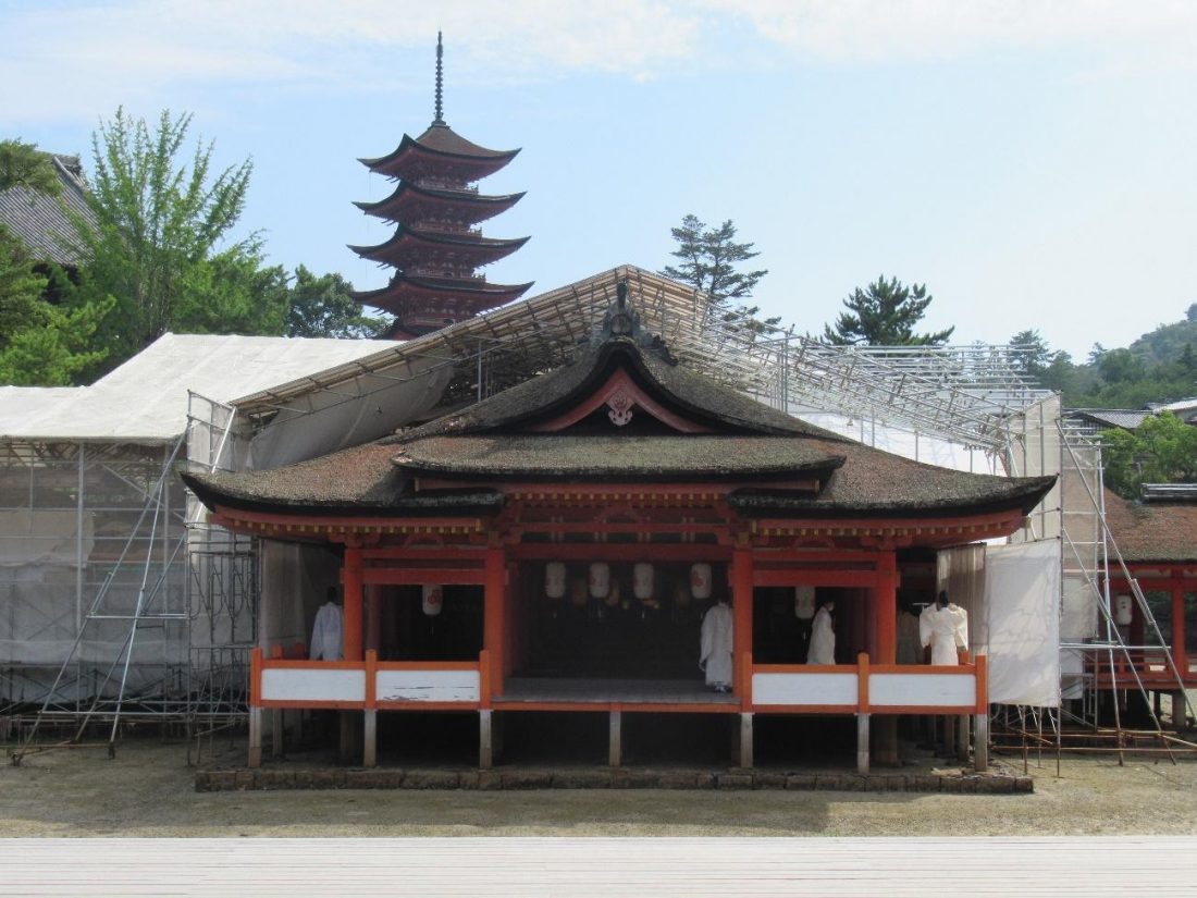 The nickname Miyajima (宮島) literally means, “shrine island,” due to the iconic Itsukushima Shrine and its seemingly floating torii, which permeate the memories of all who lay eyes on them. Visiting the shrine is an obvious item to check off on anyone’s Miyajima to-do list, but the key to enjoying this site on a whole other level is to drop by on certain days throughout the year when events take place. You may catch a bugaku performance on the stage or be just in time for the Kangensai festival in summer, but the easiest event to see would probably be the Shosaishiki that’s held on the first and seventeenth day of every month. I happened to show up on the first of August well before 9:00 a.m. when the ceremony would begin. Since the torii and the western part of the shrine was under refurbishment, greatly impacting the scenery, I would have to count on something exciting within the shrine to pique my interest today.