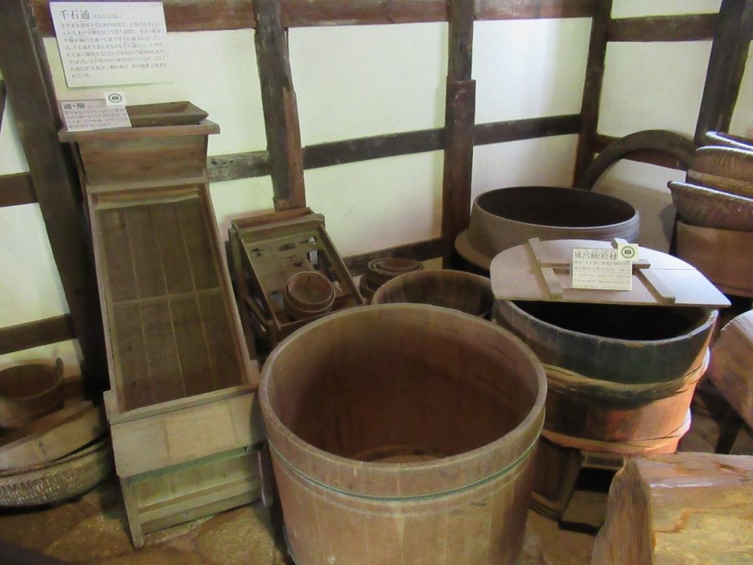 The first three exhibit rooms are small enclosures filled with old instruments like these wooden bathtubs and this rice sieve that have survived into the present day. The fourth exhibit room is larger, air-conditioned, and recounts the tales of the reconstruction of Itsukushima Shrine by Taira no Kiyomori in 1168 as well as the Battle of Itsukushima, which occurred in 1555. The first floor has pictures of the shrine in the past, a short film (with English subtitles) explaining the structure and history of the shrine, and a short section explaining the current renovations taking place. The second floor is filled with paintings and realia dedicated to the Battle of Itsukushima, in which Sue Harukata attempted to invade Miyajima, which was occupied by Mori Motonari, failed, and committed seppuku (ritual suicide) on the island.