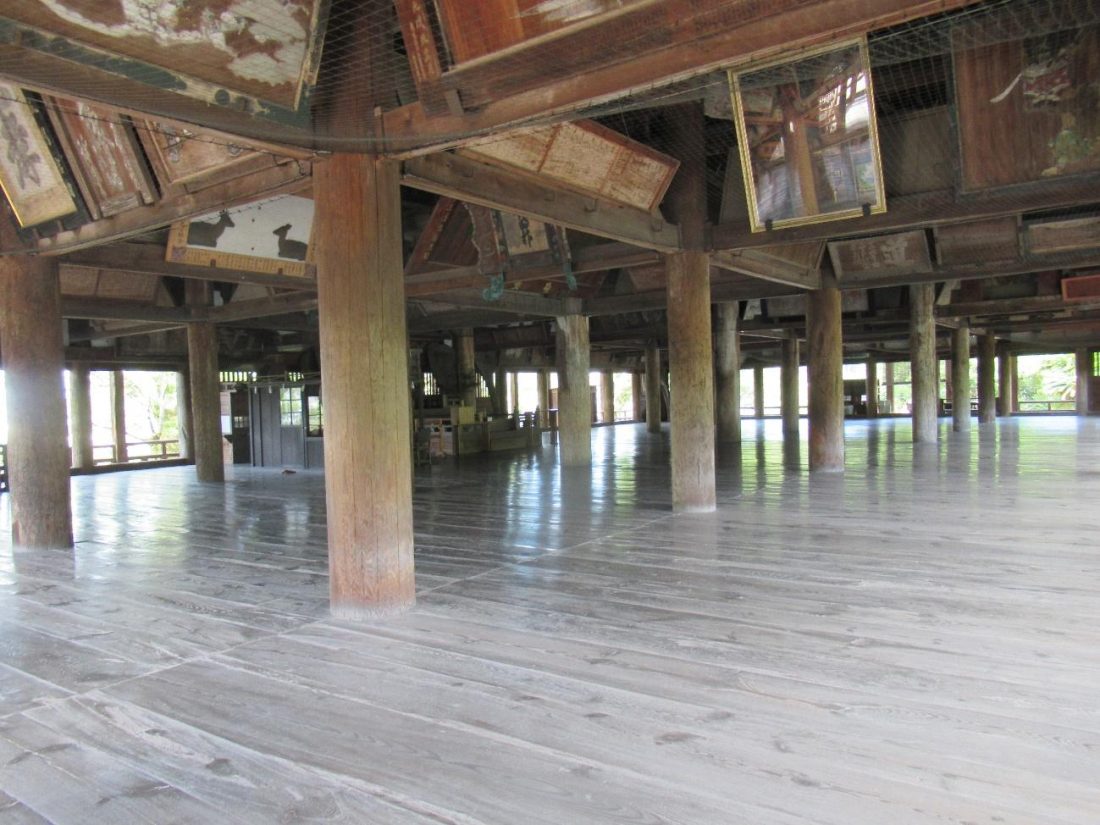 In addition to historical artwork adorning the beams where walls and ceilings would be, there is also a small shrine inside where guests can pray. The name Senjokaku (千畳閣) refers to a building that is one thousand tatami mats in area (one “jo” is typically used to measure dimensions of a room even today). For comparison, the bedroom in my apartment measures eight “jo,” as there are eight tatami mats on the floor, so I humored myself thinking of how many of my rooms could fit into Senjokaku. Step onto the balcony in any direction and be rewarded with landscapes of town or the sea.