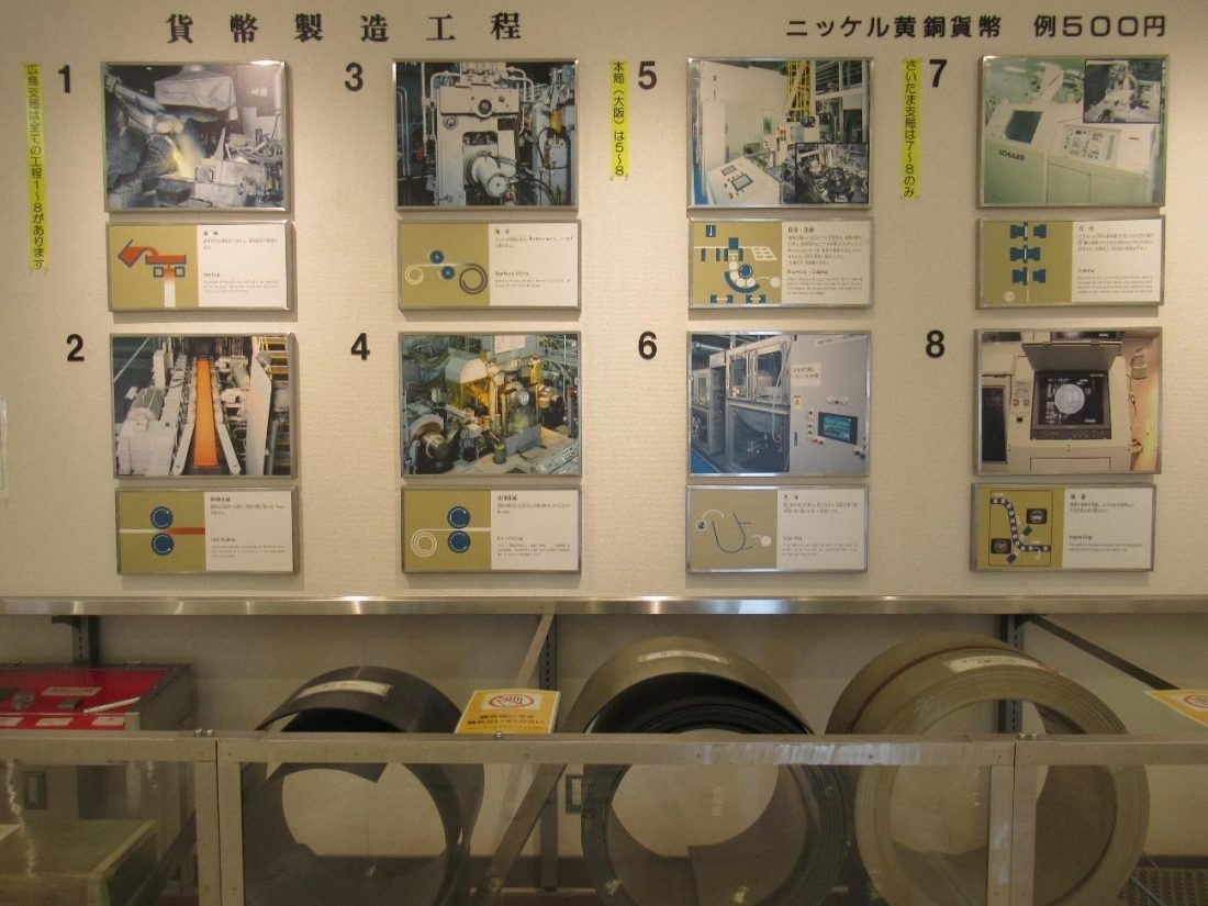 Perhaps the most remarkable display was the section that showed every step in the minting process, from melting to bagging. There are roughly eight steps involved before the coins enter circulation, and the Hiroshima Branch is capable of all of them, whereas the Head Office and Saitama Branch can only handle some. In steps one and two, the metals necessary to make the coin are melted into ingots, which are then flattened to a certain thickness and coiled up by a machine. Once the ingots cool down, steps three and four involve milling them and rolling them into the exact thickness of the desired coin type. This is followed by steps five and six, wherein blank discs are punched out from the ingots, given an edge for definition, heated to soften up the discs for stamping, and then washed in chemicals to remove oils and oxidized film. For step seven, when the discs are dry, the die stamps the design on both sides and the edge of the coin is milled, if applicable. Lastly, step eight has the coins inspected for accuracy and then placed into bulk bags for shipping.