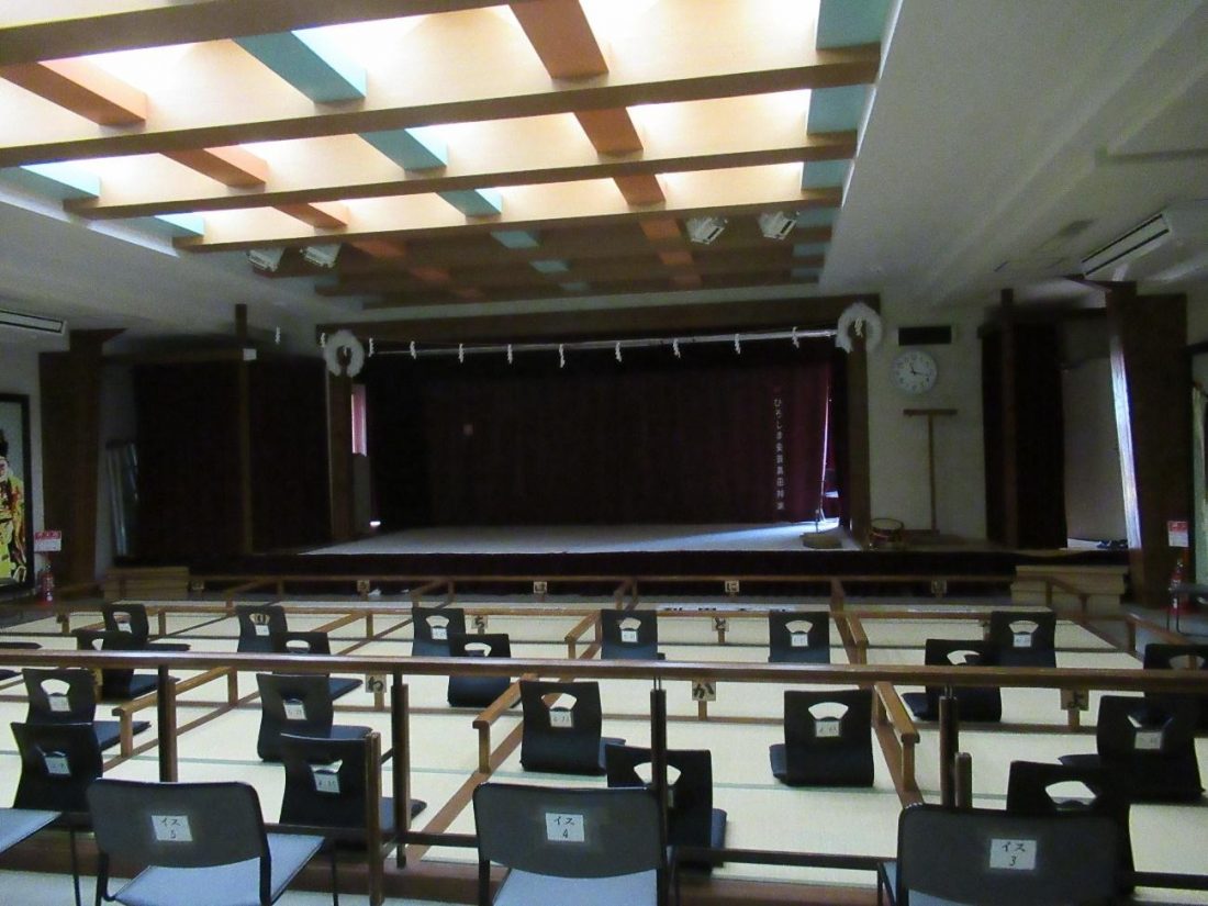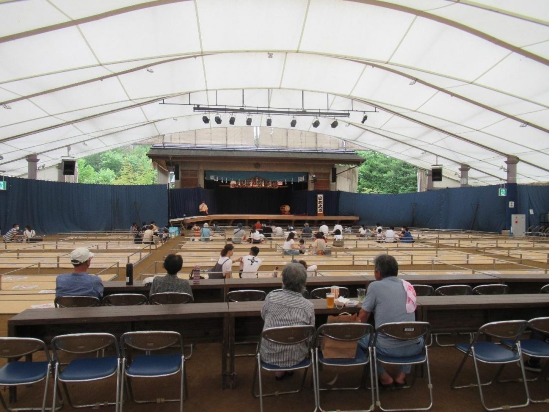 Such flavorful delights had me calling for refills on rice, and by the end of the feast, I was bloated and ready to sit down for some afternoon kagura. I paid and rushed over to the Kagura Dome, which thankfully wasn’t far, flashed my ticket, and picked a tatami seat near the stage where I could sit comfortably with my shoes off. They also had stands and vending machines inside selling snacks, drinks, and souvenirs, but I was too full to want anything, and the show was already starting. This would be the first of two shows today, and one ticket grants admission to both.