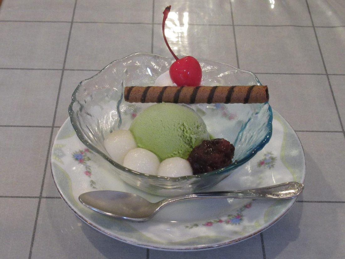 If I had to pay for each showing, I would’ve found it expensive, but two shows for the price of one ticket was a bargain indeed! As soon as the performance ended, people started getting up to leave, and locals who drove here just to watch kagura on a Sunday afternoon made their way to the parking lot. Meanwhile, I still had a good twenty minutes before the next shuttle bus, so I stopped by Kura, a café with a warehouse-like interior, as its name (蔵) suggests. I ordered an ice cream zenzai, a cold, summertime twist on a traditional Japanese dessert, and the waitress went behind the counter and got straight to building my afternoon snack. Zenzai is usually a hot, sweet soup with red beans and rice cakes floating inside, but this ice cream zenzai featured one scoop of green tea ice cream, a small glob of red beans, three freshly boiled rice flour dumplings, a pile of whipped cream with a cherry on top, and one chocolate-lined rolled wafer. Although my lunch was substantial, I was pretty peckish by the end of the kagura performances, so a dessert like this hit the spot and provided a perfect conclusion to my tour of Kaguramonzen Tojimura.