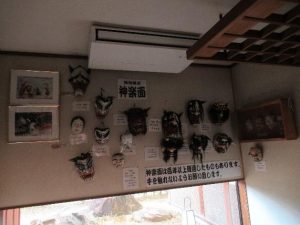 Upon entering the kagura museum, visitors are met with a gift shop selling local handicrafts and toys modeled after kagura props, such as swords, axes, polearms, and bows with arrows. The exhibition room features information pertaining to the history and geography of kagura, as well as mannequins in costume and old props used in the performances of yesteryear. Outside the exhibition room down the hall, they had a limited time display on the wall starring masks from the past dating over a century. Next to that was a kagura theater, a room significantly smaller than the Kagura Dome where yokagura is performed. On Friday and Saturday nights, guests staying overnight would watch the shows here, but on Sunday afternoon (presumably when more guests are making day trips here), the performances are held in the larger Kagura Dome.