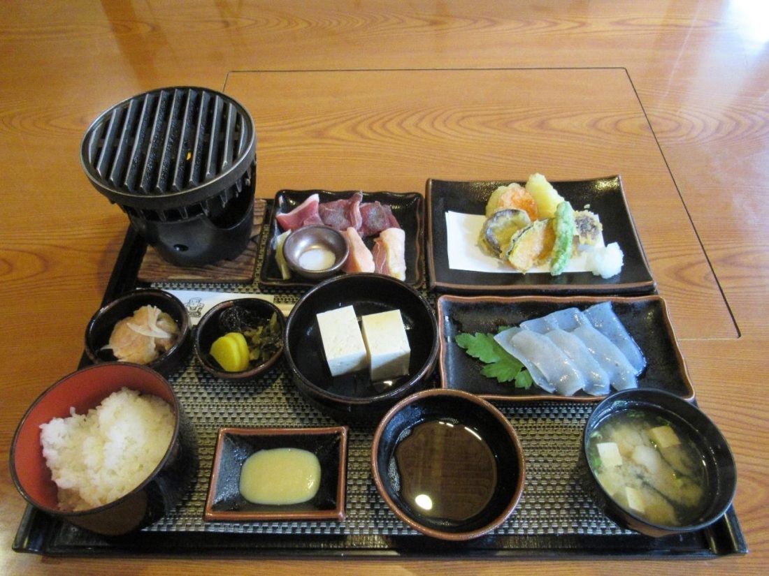 It wasn’t yet noon but my tummy was already growling, so I stopped by the traditional restaurant Fukusuke for some rustic gourmet fare. The restaurant interior is as old-fashioned as the exterior; guests remove their shoes before entering and sit on floor cushions at low tables, as opposed to chairs at high tables. They sell things such as made-in-house tofu, noodles, sushi, tempura made with vegetables of the day, and a variety of meats, including beef, chicken, horse, and even wild game! I got their “Woodland Blessings Set Meal,” which came with cuts of chicken, venison, and wild boar that I would grill myself, the aforementioned fresh veggie tempura (with soy sauce for dipping), their locally renowned tofu, vegetarian sashimi made from konjac, a sweet mustard dipping sauce for the konjac sashimi, nanbanzuke (pickled fried mackerel), tsukemono (Japanese pickles), miso soup, and steamed rice.