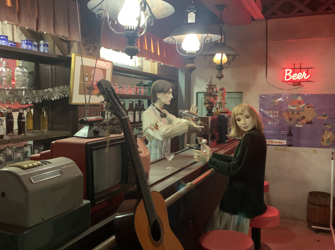 As I walked further, the area opened up to an “outside street” area (still indoors) where there were photo studios, bars, restaurants, police stations, snack shops and so on. My favorite mannequin of mine was this drunk man wandering outside of the bar.