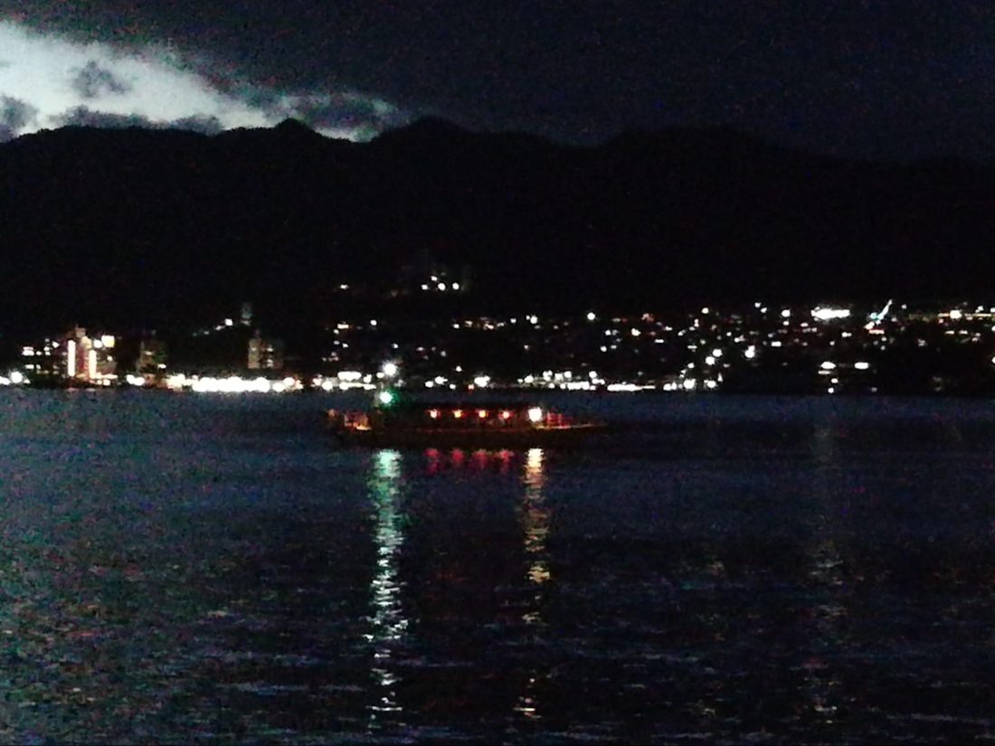 We moved out and slowed headed across the bay toward the shrine. It’s a short distance, but the boat moves slowly. In the meantime I enjoyed picking out the image of the deity in the hills the whole way, and also a wonderful starry sky that also did not show up in my camera. To my eyes though, there were constellations to be seen over the island even. Just this part of the cruise, even, was thoroughly enjoyable. As I mentioned above, once the explanation was finished, I was out on the forecastle of the ship right through till we were docking at the end of the journey.