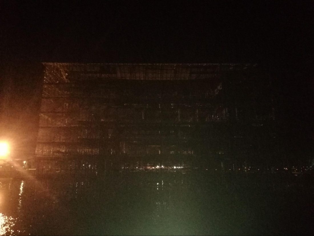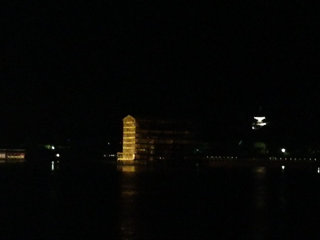 As frustrating as it is that the gate is fully scaffolded and has had its paint removed during the renovation process, there is still a massive spotlight shining on the gate, and honestly, with the shape of the gate thus penetrating the scaffolding as a kind of spooky shadow, it was still quite alluring and fascinating to see. Especially as the boat creeps more and more forward and the gate just grows and grows in front of you. When the scaffolding is gone, the new red paint shining in the spotlight, and the boat actually passing through torii it’s going to be mind-blowingly amazing. I can’t wait!