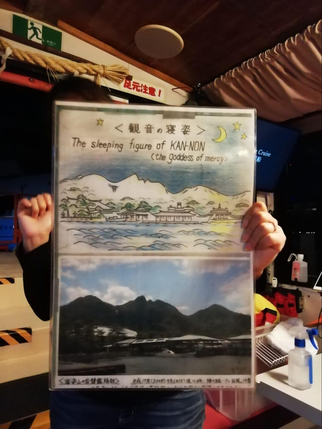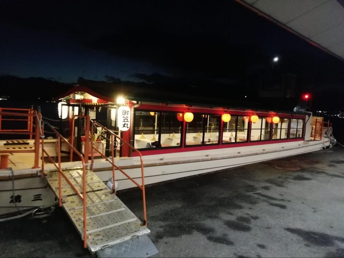 First, it was fascinating to see the sleeping “kannon” or deity soon after the ship pulled out. I had long known that the island itself was sacred. I had also known it was home to a female deity. I had never heard it said that the island itself LOOKED like a female before, until the guide’s speech in the cabin. But once she told me, and showed the sketch of what to look for, it was clear as a bell. My jaw dropped. It was so easy to spot it is really quite remarkable. Sadly, my phone’s night lens is weak. I don’t think you can see it well in the photos I was taking. Pro Tip: look for it in the daytime for the photos to impress your friends. If doing a night cruise like me, at least be sure your camera or smartphone has a really good night setting. My photos simply don’t live up to what I was seeing with my eyes. I tried enhancing my photos, but though it was clear to my eye even through my camera lens, I don’t have a good enough photo for here. It truly is easily spotted, however.