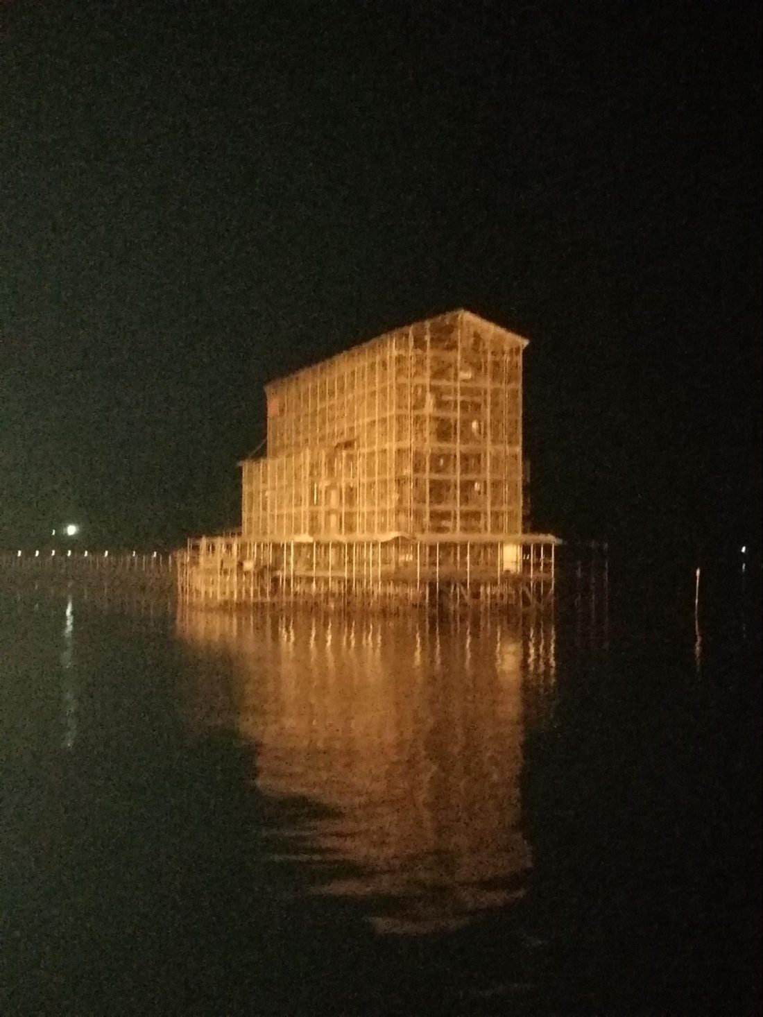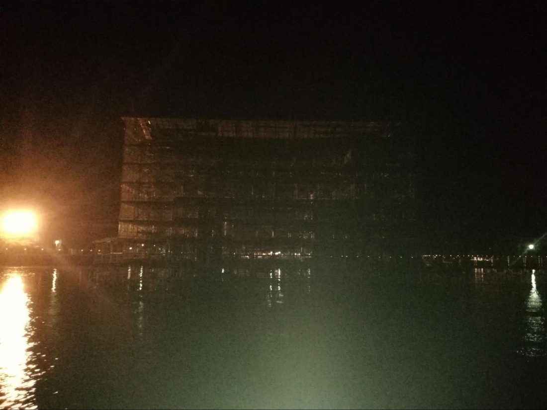 After getting close, the boat slips to the left, allowing a view of the shrine itself behind. The guide quickly warns that this is the only and only chance to get both gate and shrine in view at the same time. So be ready with your camera here. The boat then drifts further left, toward the spotlight, affording, when the renovation is complete, some of the most iconic photos of the gate possible, some of the very ones found on postcards to this day. The guide assures me that with the new coat of paint these photos will be amazing. For now, as the spotlight hits from this angle, the silhouette of the gate mostly disappears and the scaffolding takes on the look of a new home being built in the water. Though box-like in appearance it’s impressive in its own way. The boat then turns and heads back to the pier ending our journey.
