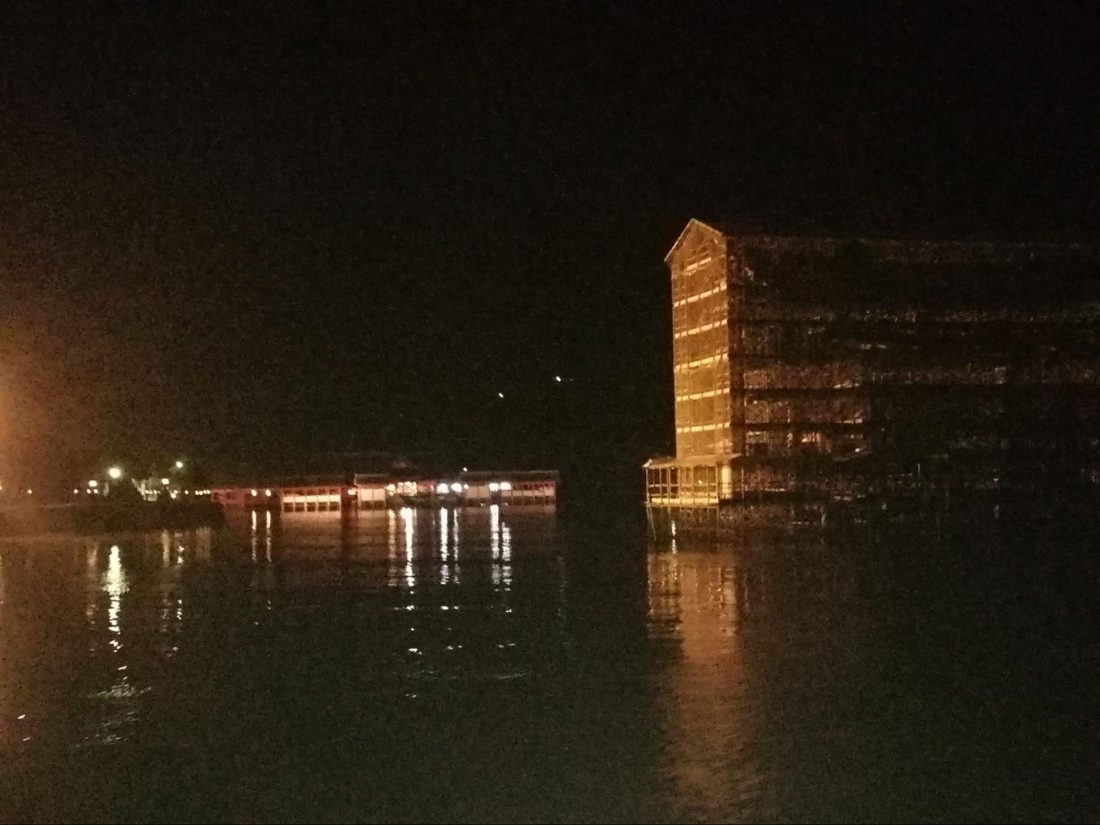 For now, the boat gets extremely close. So much so that it is nearly impossible to get all of the gate in the frame of my camera. It looms over you and simply demands for you to be impressed with its size. It’s awe-inspiring in this night time approach.
