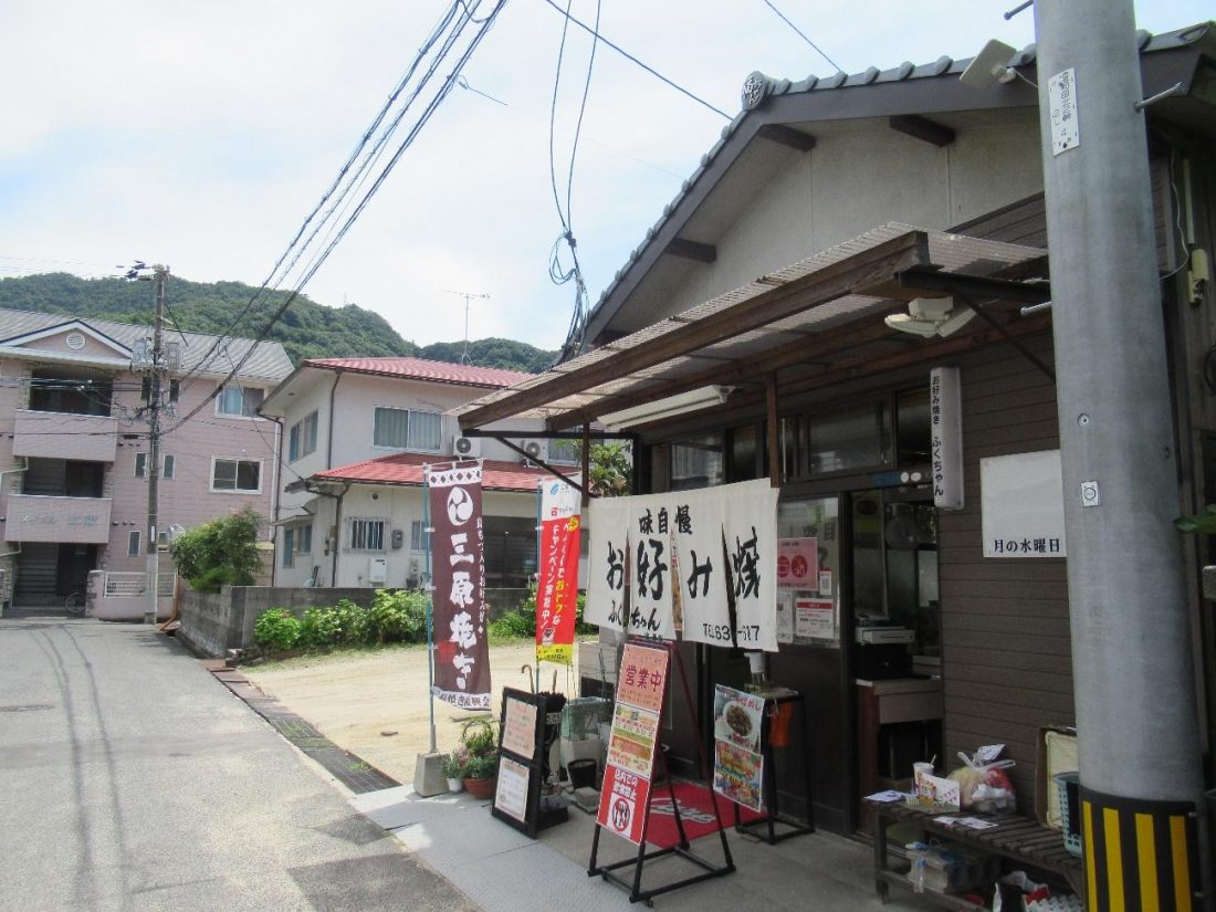 After descending the mountain and re-entering civilization, I walked past some quaint houses and gardens, then hung a left at this intersection. From there I turned right, walking down a slope, and took a left up until the road merged with a bigger and busier street that leads to a bridge. I walked up to the bridge, but rather than crossing, made two right turns to find ふくちゃん (Fukuchan), an eatery that serves up Miharayaki, at the end of the street on my right. It took some time to reach the restaurant, but thankfully, I still made it in time for their lunch business hours.