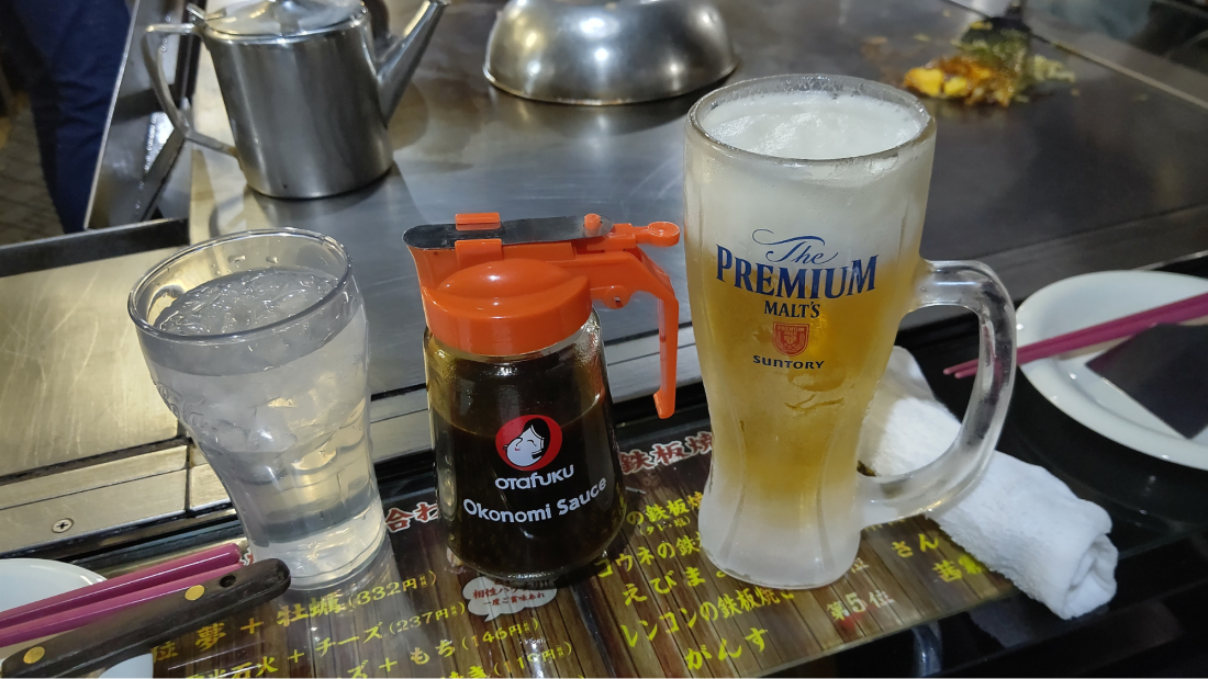 The highlight of my evening was definitely my meal at Denko-Sekka. When they called my number, I sat down and ordered a big, frosted mug of beer. It’s a little warm in front of the hot plate so the icy, cold beer helps offset the heat. At least half a dozen different okonomiyaki were being cooked simultaneously. You can watch every move the cooks make. Hiroshima okonomiyaki is layered, so they cook most of the layers separately and then start stacking them together at the appropriate time. The cooks work really fast and skillfully, it is fun to watch. At Denko-Sekka, every time an okonomiyaki is finished and placed in front of the customer, a chorus of “Yukuridozo!” or “relax and enjoy!” sounds off from all of the staff. Sure enough, when my okonomiyaki came, it had that beautiful, rounded, fluffy omelet and the staff all cried “yukuridozo!”. I cut into my okonomiyaki with the little spatula they provided me and served portion after portion onto my little plate. It was delicious! And the egg was just as fluffy as it looked. Okonomiyaki is always really filling! Be warned if you’re eating one by yourself like I did. Depending on how hungry you are and how good you are at eating large portions, you may not be able to finish it.