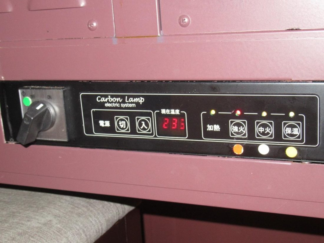 It gets a little more complicated from here, so before we move on, I’ll explain the griddle table a little more. The brown spots on the table are where the flame burns strongest, the silver area has the weakest heat, and the transition zones between brown and silver burn at an intermediate temperature. As can be seen from the pictures, we’ve been grilling on medium heat the entire time. At this point, the chef instructed us to turn up the heat and move our okonomiyaki to the center of the brown spots. There’s a control panel underneath the table that lets cooks control the overall table temperature.