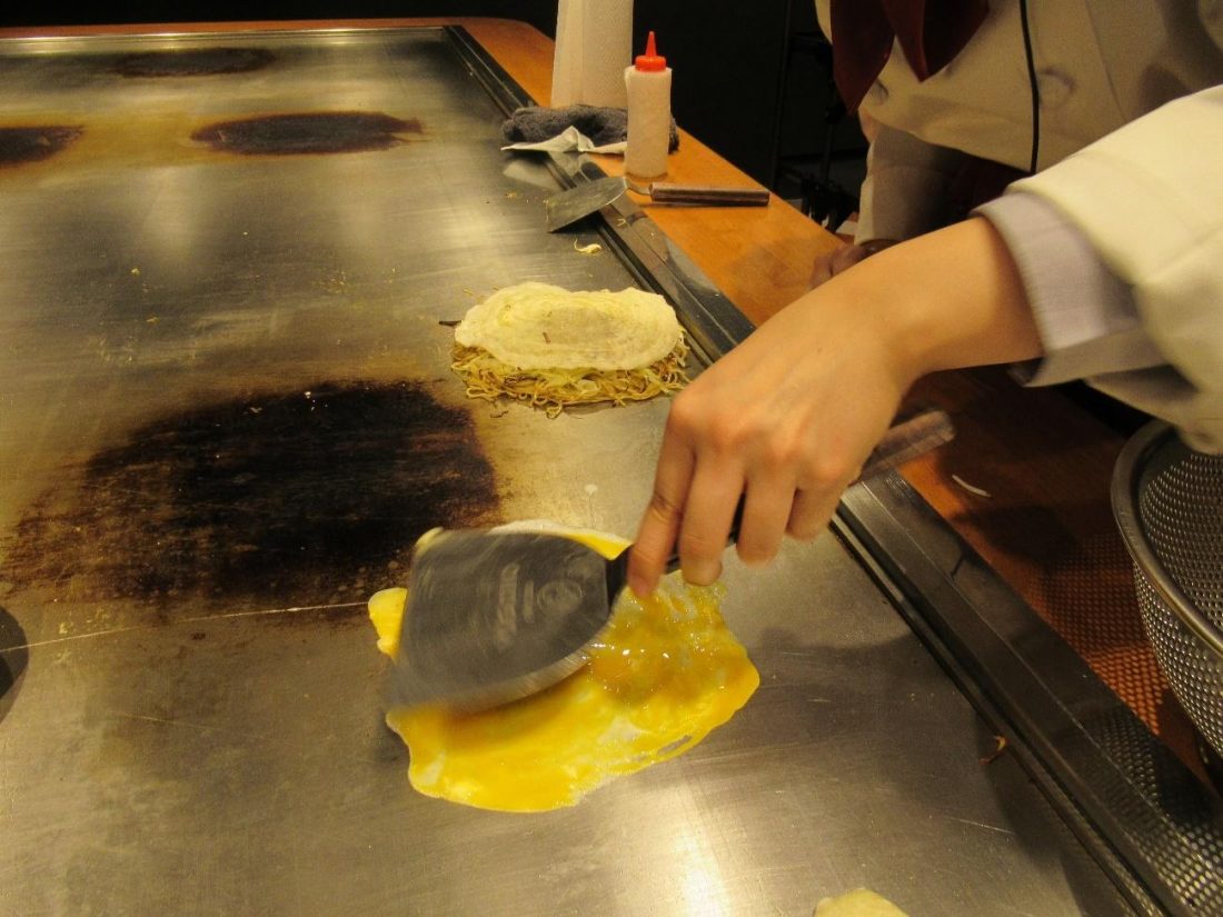 After that, we were taught how to make the egg disc, but before we began, the chef asked me if I could eat eggs. I told her eggs were fine, but if you’re vegan you can skip this phase. We copied the chef in cracking the egg onto the medium zone of the griddle, breaking the yolk with a spatula, and smearing it into a disc the same size as our okonomiyaki. It takes a little while for the egg disc to solidify, but the chef stressed that it’s vital to stack the rest of the okonomiyaki on the egg while it’s still half-cooked. We timed our stacking right, then flipped over our okonomiyaki just like before to complete the process.