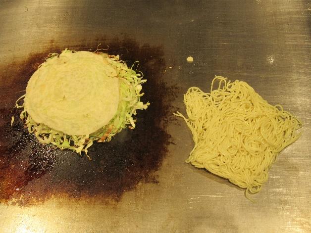 Next up were the soba noodles, which came in a plastic pack. We massaged the noodles while still in the pack before opening it and cooking the noodles on low heat. The chef added a little oil to them and had us stir-fry them with Otafuku sauce. A special bottle of organic, vegan Otafuku sauce was prepared just for me. When the noodles were done, the rest of the okonomiyaki was stacked on top of them in the silver area.
