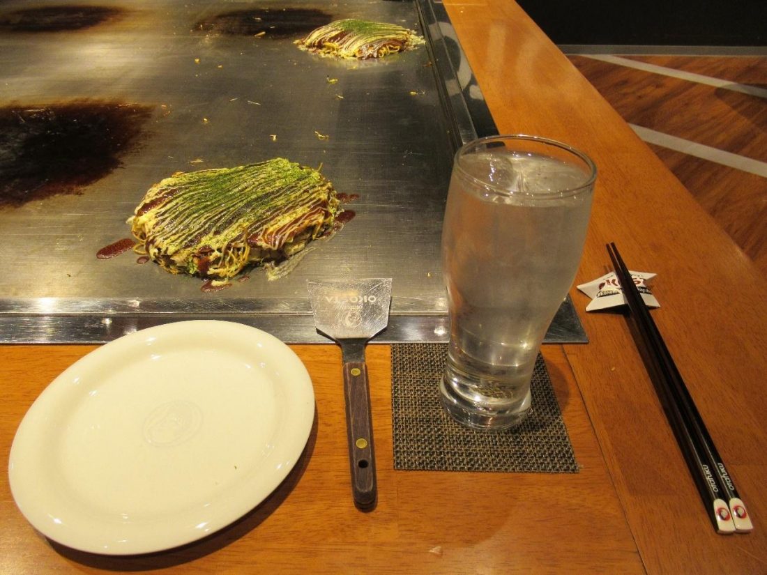 We sat down to eat, and the chef used her smartphone and ours to take pictures of us with our finished products, then let us dine in peace. If I hadn’t gone with the vegetarian plan, I would have been able to decorate my okonomiyaki with one more topping (chosen at the beginning of the lesson) and try a variety of different flavors of Otafuku sauce at the sauce bar. Some of the flavors featured are exclusive to this establishment, so I’ll have to give them a taste one day when I’m not undercover. The chef came by to take drink orders while we dug in, so if you’re craving something besides iced water or ordered an all-you-can-drink dinner plan, this is your chance to find a suitable accompaniment to your meal.