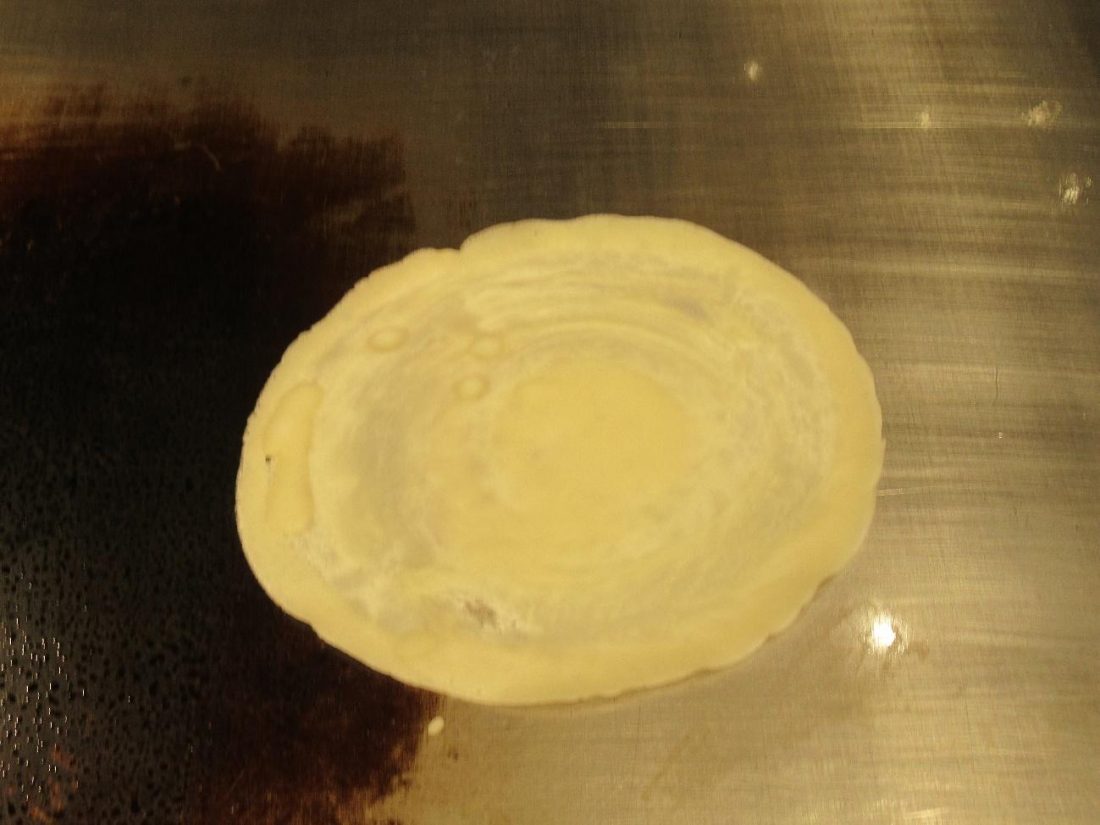 She then came over to my table to say the exact same thing in English. When making the disc with the ladle, start in the middle and rotate either clockwise or counterclockwise until the disc is uniformly flat. The resulting crêpe should be approximately 20 centimeters in diameter, or about the width of one and a half large spatulas. If a hole forms in the crêpe, simply pour enough batter to fill the hole and let it cook.