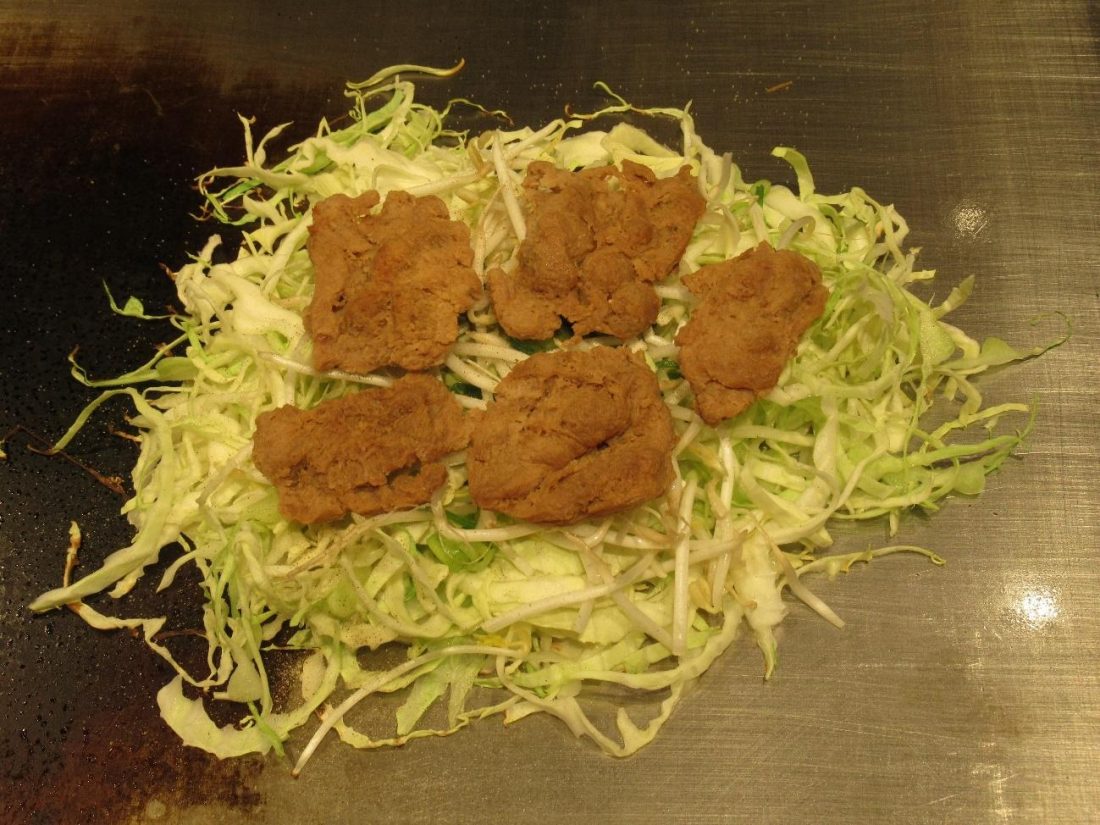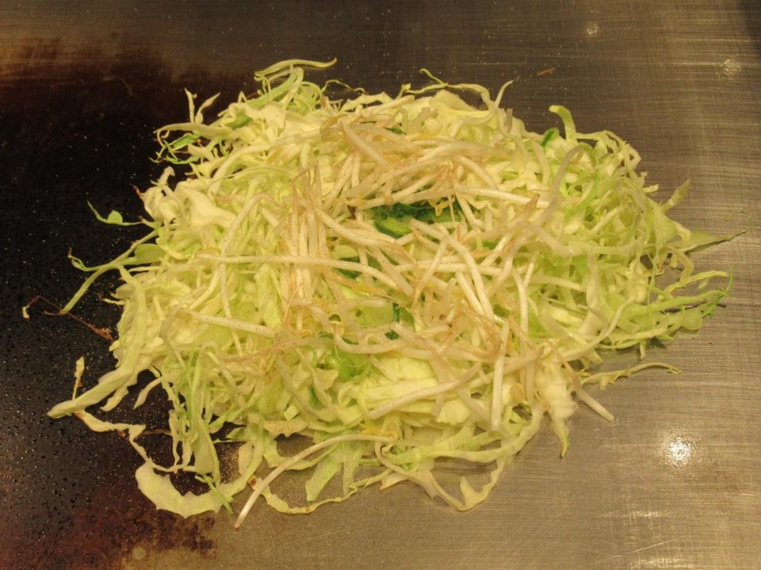 Our second task was to pile on the raw ingredients; this is where the vinyl gloves come in handy. I topped my crêpe with cabbage, green onions, bean sprouts, and pepper salt. The other guests making normal okonomiyaki got to add tempura batter bits too, but as those contain fish extract, I wouldn’t have any tonight. My pepper salt was also a vegetarian substitute for the fish flakes ordinary diners sprinkled on their veggies.