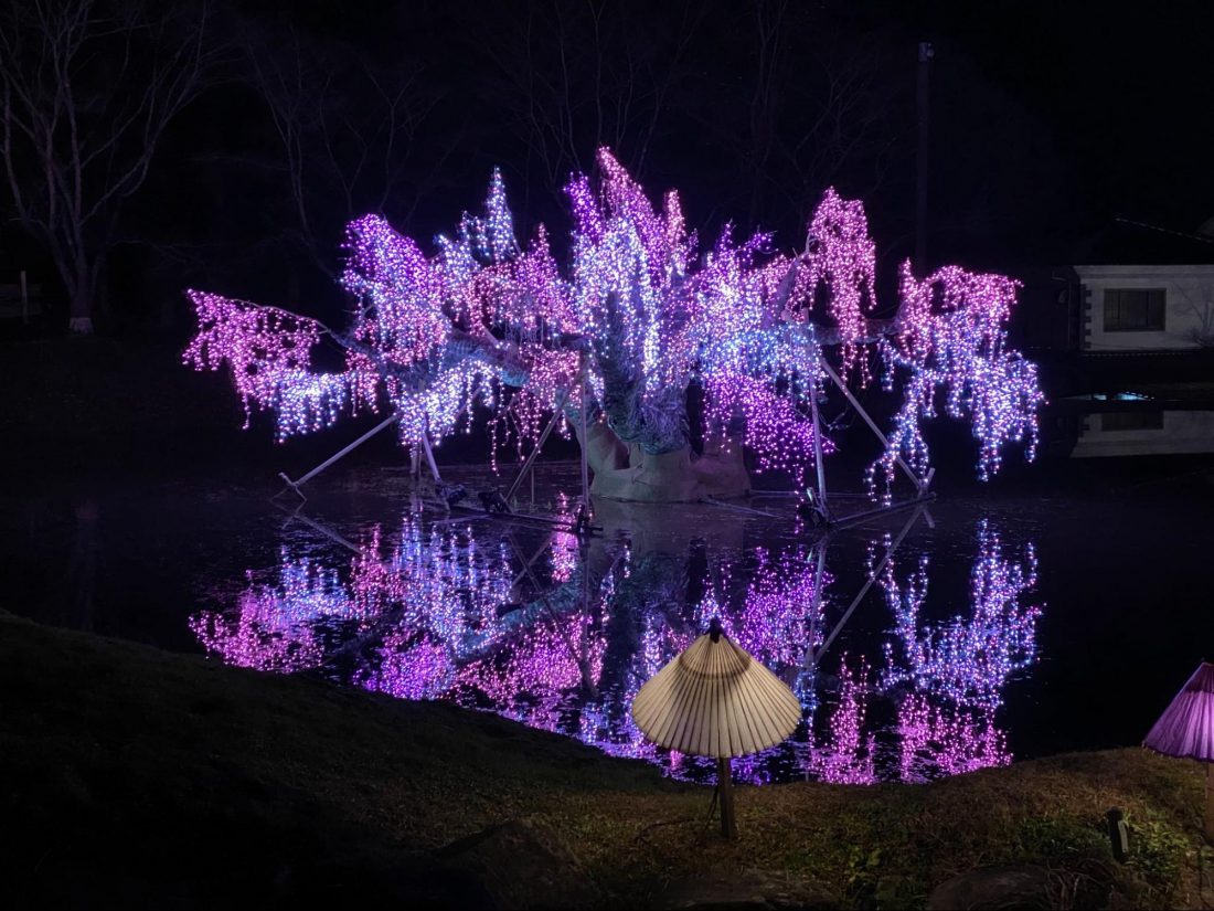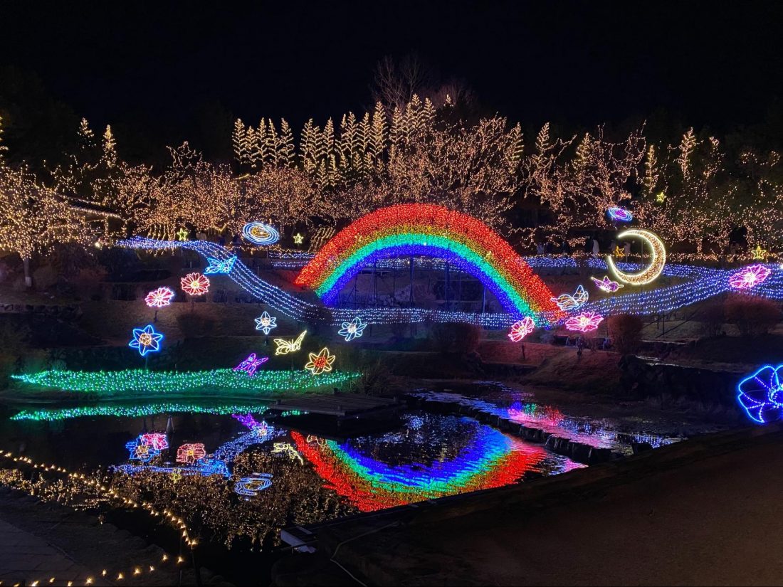 There were rainbows, butterflies, flowers, a horse, and a carousel illumination that took my eyes off the giant Christmas tree by the entrance. Then, around Hiba no Sato, the experience village, they put on Christmas lights on this willow tree they put in the middle of the pond. They also had Chinese lanterns elegantly decorated on the next pond. It was indeed magical to watch and experience.
