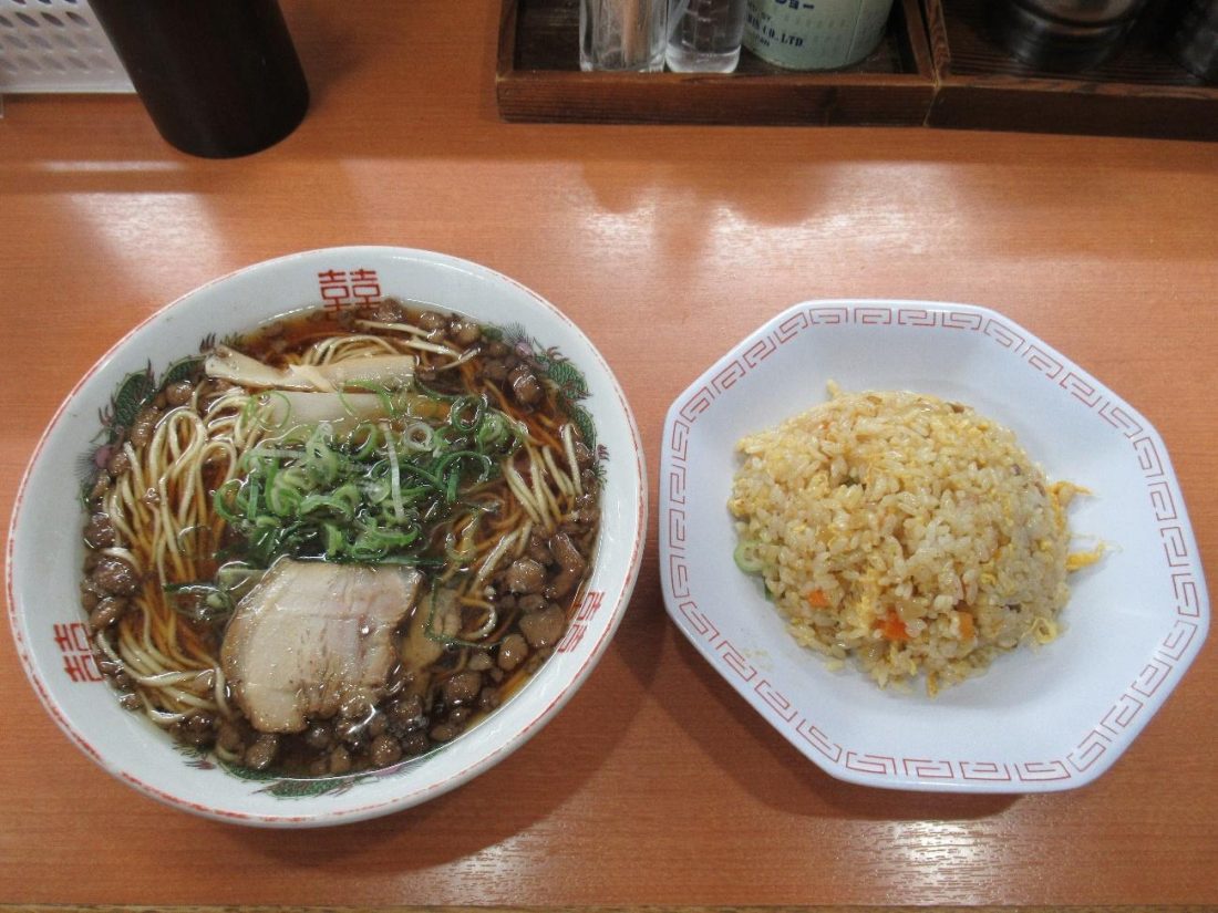 Ramen is what I’d call an ethnically confused food; the Chinese associate it with Japan and the Japanese seem to in part regard it as Chinese cuisine. One reason why is probably that the majority of ramen joints in Japan also serve up Chinese dishes such as fried rice and gyoza (pan-fried dumplings). Onomichi Ramen Akatsuki serves up ramen by itself or as part of a set that comes with fried rice, karaage chicken (another ethnically confused food), or both. I decided to fill my belly with a classic ramen and fried rice set, both of which were prepared to order and placed in front of me minutes later.
