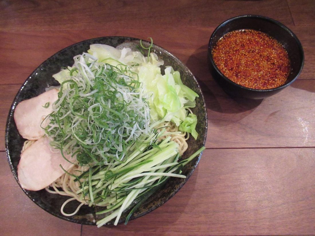 Bakudanya serves several different kinds of noodle dishes, but the Hiroshima-exclusive spicy tsukemen is what I’m here for. Once again, I got a healthier version with extra vegetables, so my order came out with only two slices of pork, but big piles of cabbage, green onions, and shredded cucumber, accompanied by the dish of broth with sesame seeds floating inside. Customers specify their desired level of spice on a scale of one to eighty; the default is level two but I went for level four.