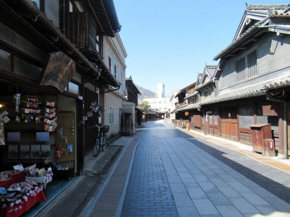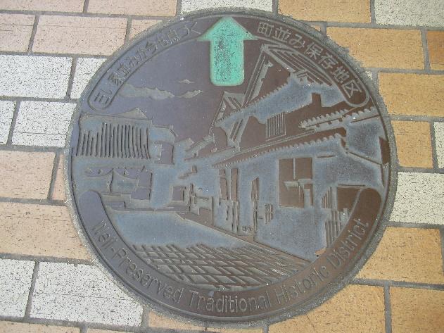 After stepping off the train and leaving Takehara Station, I walked past the tourist information center on my right and made haste for the Preserved Historic District, with the way kindly indicated by signs and the city’s decorative manhole covers. Anime enthusiasts may know that Takehara was the setting for a show called “Tamayura,” and sure enough, homage to this show can be found all over the city, in the form of cardboard cutouts in front of the tourist information center, posters in shop windows, and let’s not forget the colorized manhole covers on the narrow shopping street! I continued north on the brick-laden sidewalk until it terminated at a busy intersection; after crossing that street and trudging for about three more blocks, I turned right at the next traffic light, crossed a bridge, and found myself in a time capsule of a town, the Preserved Historic District.