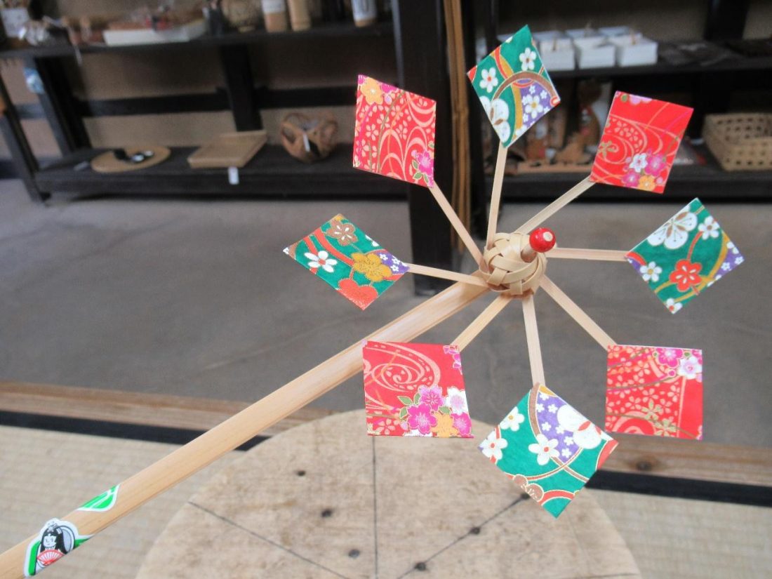 Today I chose to make a single-decker pinwheel, and the workers promptly brought the ready-made parts for me to assemble, with some colored paper rectangles I would pick out and paste onto the spokes. With the kind lady’s guidance, I was able to quickly put my pinwheel together, and after being taught how to properly spin the wheel without wind using a swift swing, I placed a sticker featuring Princess Kaguya—a mascot of Takehara—onto the handle to complete my souvenir. They also provided a little plastic sleeve and a twist tie to protect my pinwheel for the rest of the day, a much-needed service as I still had places to go after this.