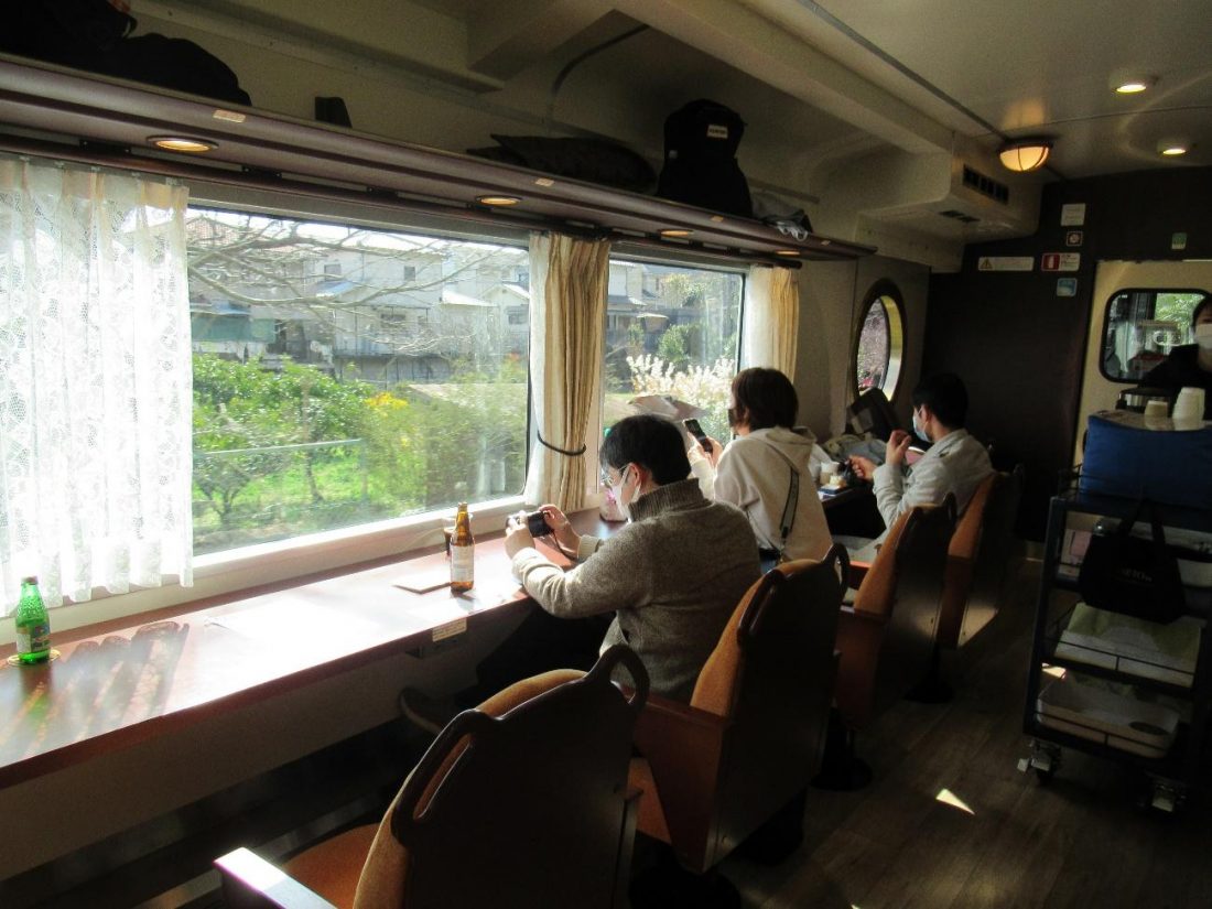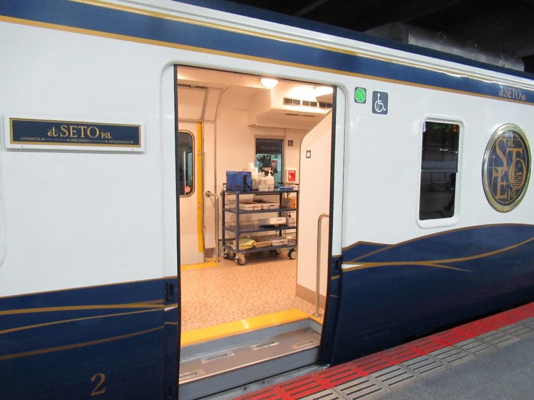 Before boarding the etSETOra, I found a welcoming committee of the crew standing outside on the platform, greeting their guests who would soon experience lots of Seto Inland Sea vistas in style aboard the blue and white train. As I took an initial peek inside and saw the snack cart, the bar area, and passengers inside frantically taking photos of the interior, I knew I would be in for a classy ride. I promptly found my seat and plopped down, poring over the refreshment menu in front of me while I eagerly awaited our departure.