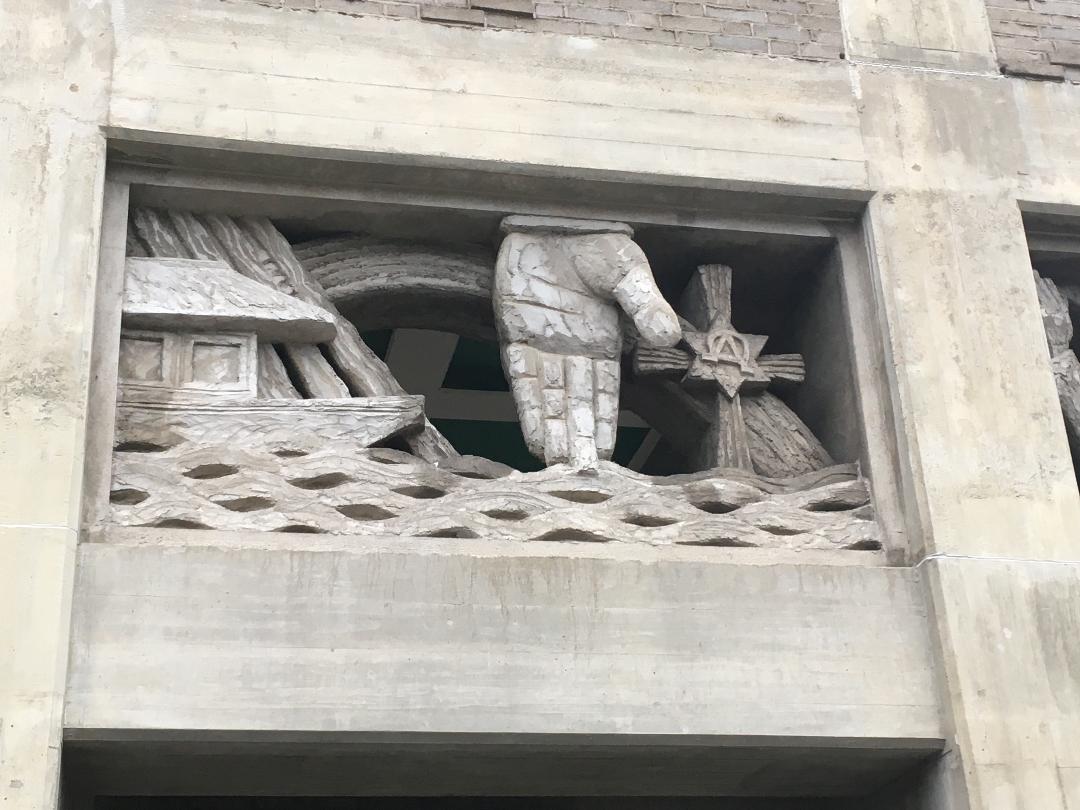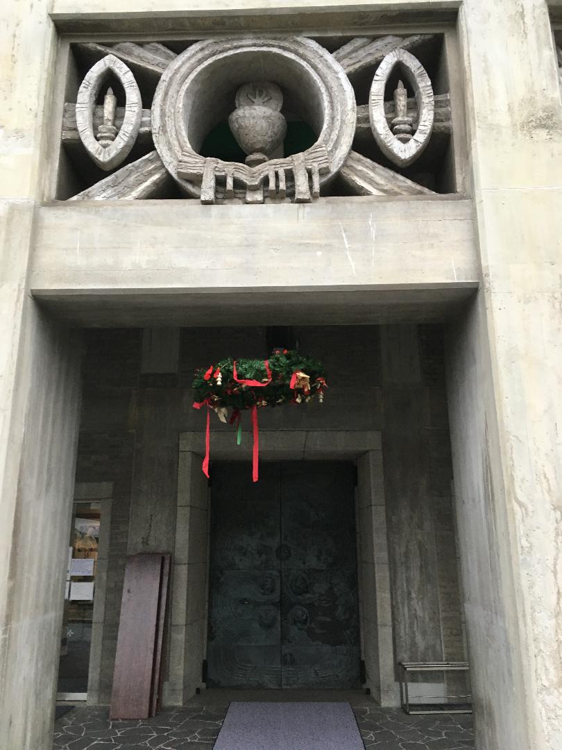 The main doors are impressive slabs of bronze and the stone sculptures above and outside them were created by Kenji Imai.