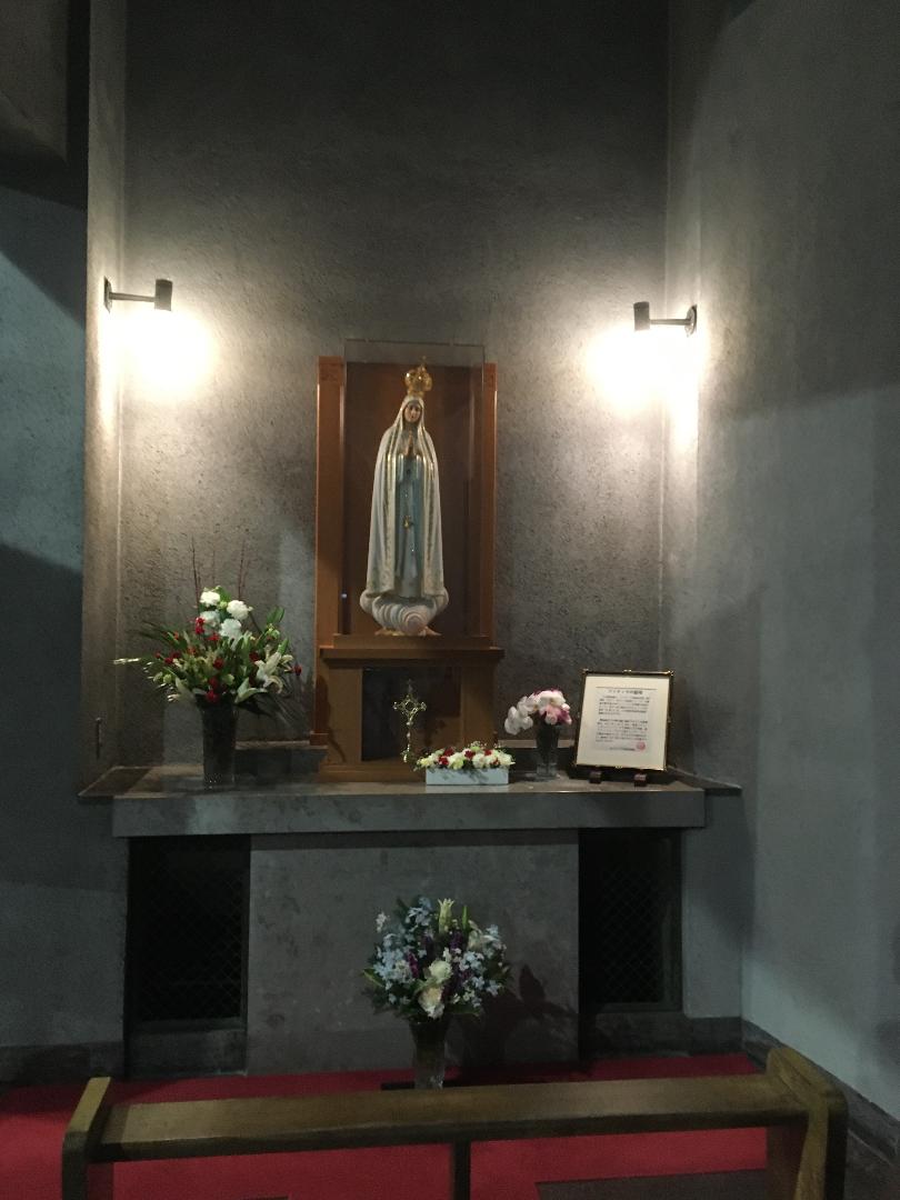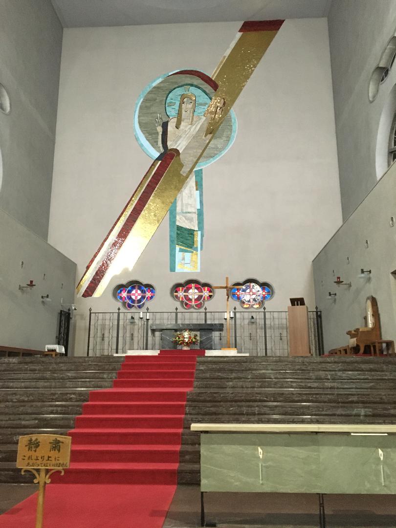 As mentioned, I visited the Cathedral with my son who is a “double”, fully Japanese and fully English. The following is his impression. “There wasn’t any holy water and there were spaces between seats due to the Covid outbreak. It was interesting to see a religious building being affected by the virus, and the precautions being used against it. The building itself was interesting, with a mixture of curves and straight lines, and there are many differences to the church in my hometown (St. Xavier’s in Yamaguchi city). The stained glass behind the main hall was very beautiful and mesmerizing. They sell the guide of the church (history of the church, the meaning behind the sculptures and the creation of the church) for 500 yen in the nearby shop. It was interesting to see the small Japanese garden in front of the church.”