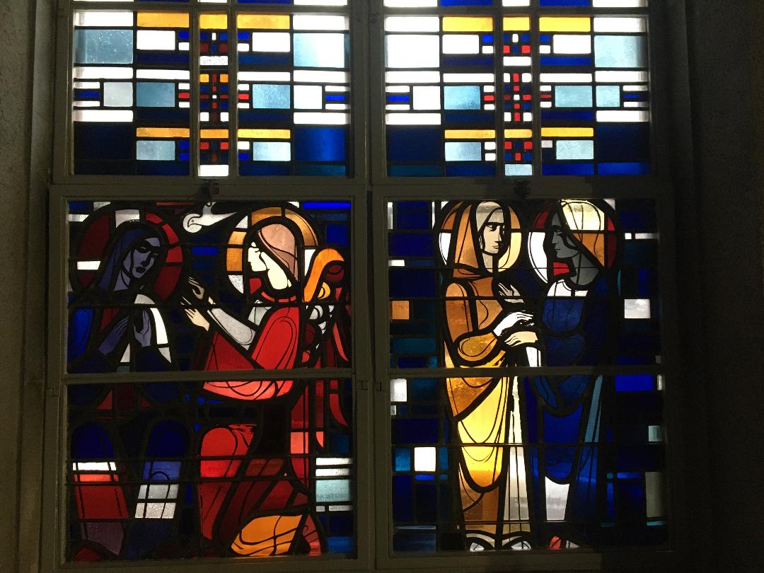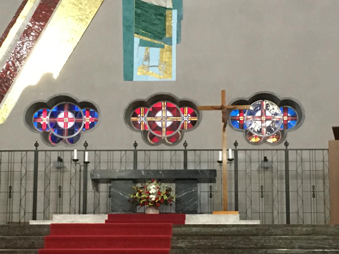 The altar area is really beautiful. There are 3 bright windows, which highlight the central feature of the altar at a small scale. Zooming out, there is a large mosaic of Jesus and the Cross (incidentally donated by the Chancellor of West Germany).