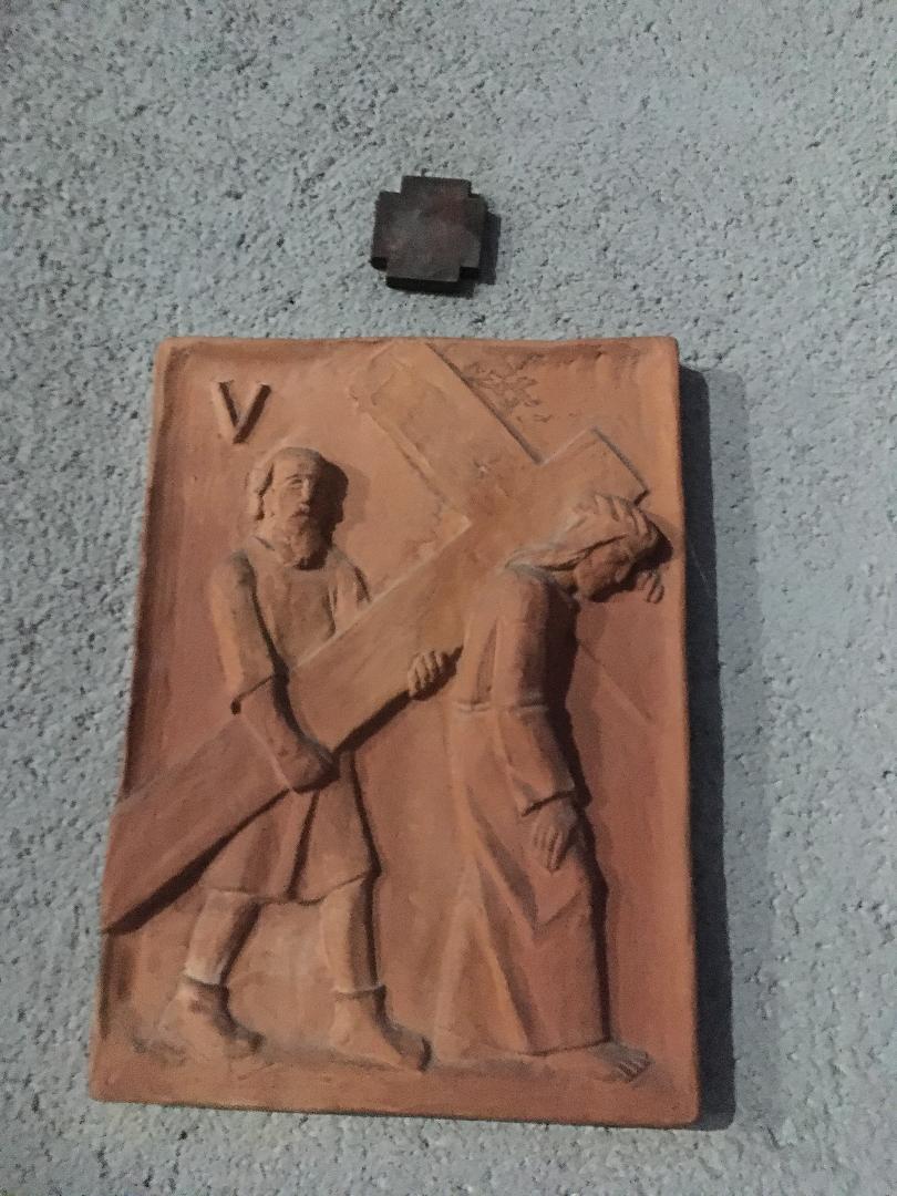 We moved inside, and I spent the first few minutes looking for the holy water to bless myself, but it had been removed due to Covid. There is the baptismal font in a side chapel on the right, then the confessional boxes. I thought I would start by explaining the 14 Stations of the Cross to my son. These are simple but effective ceramic tiles: here is Simon of Cyrene helping Jesus to bear the cross.