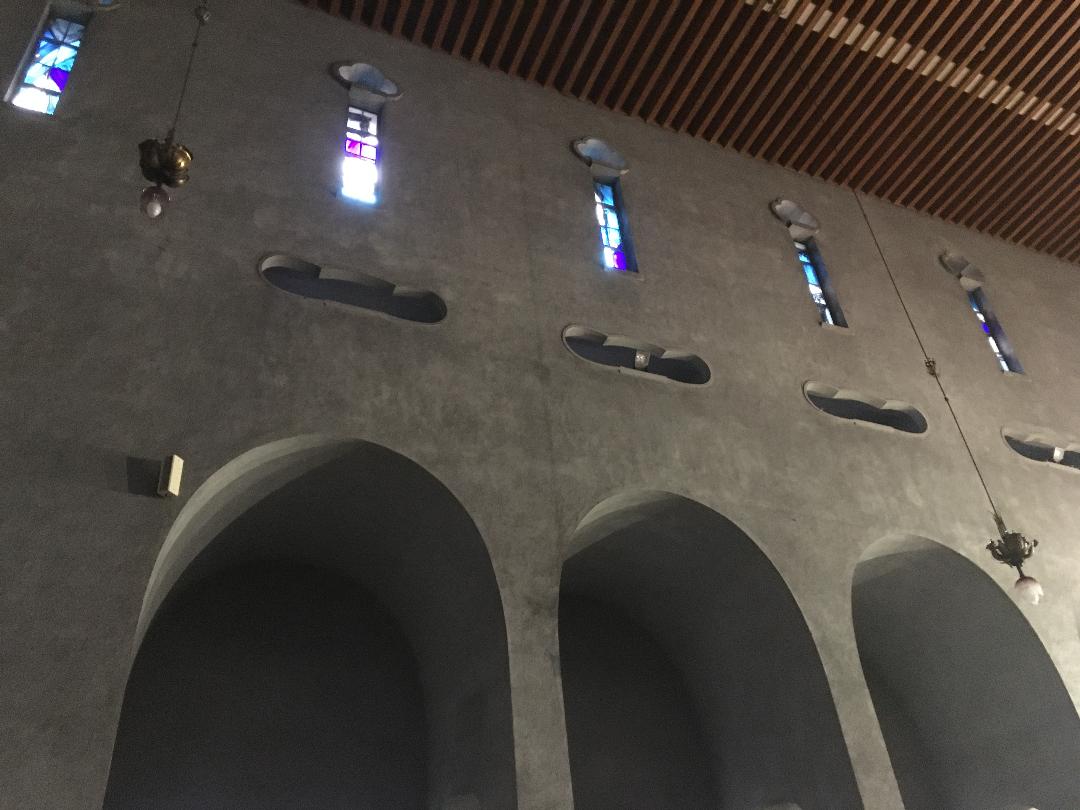 Researching online before making the trip, I learned a couple of salient points about the cathedral’s construction. The building was initiated by a Jesuit missionary, Hugo Enomiya-Lassalle, who had been working as pastor for the Noboricho parish (or, conflictingly, the vicar of Hiroshima) when the bomb was dropped in August 1945. He was critically wounded but survived, and made it his mission to raise the cathedral on the ruins of his church, as a monument to love and peace, and as a memorial to the victims of that crime. Secondly, the tower was designed to resemble the A-bomb dome, although I would never have made that link had I not read it. Togo Murano was the chief architect.