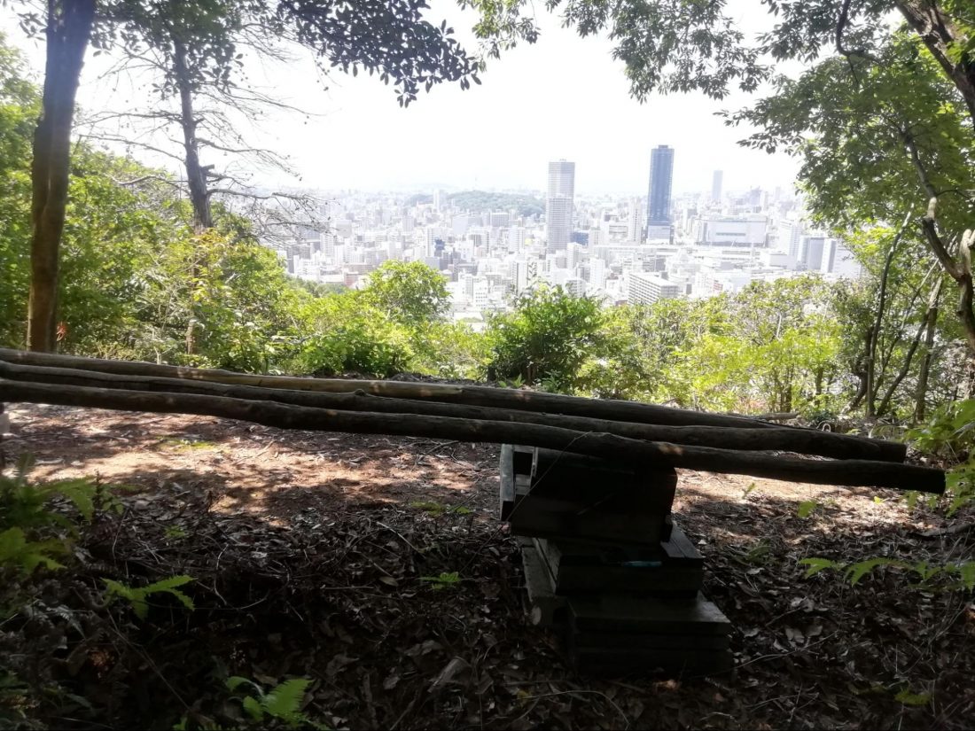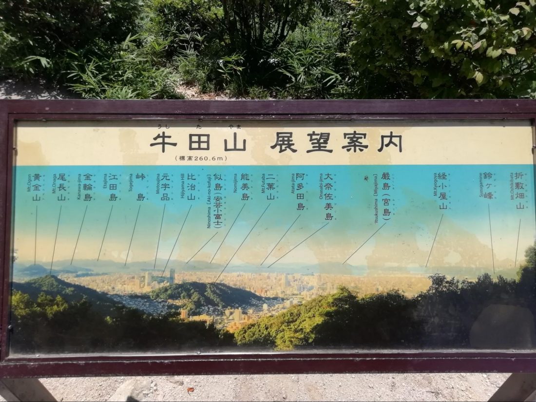 After one five-minute break on one of those tree trunk benches (I use how hot it was that day as my excuse), I reached the top of Ushita-yama. There is a rudely-constructed pavilion here complete with a calendar on the wall (I’m not really sure why) and a table to sit at, with a second picnic table under the open air. If you brought food, this is the perfect place to consume. Myself, I was there for the view only – and it’s fantastic. There is a greatly appreciated viewing guide posted as well, so you’ll know that you are seeing Miyajima and many other islands of the Seto Inland Sea, as well as the entirety of central Hiroshima city.