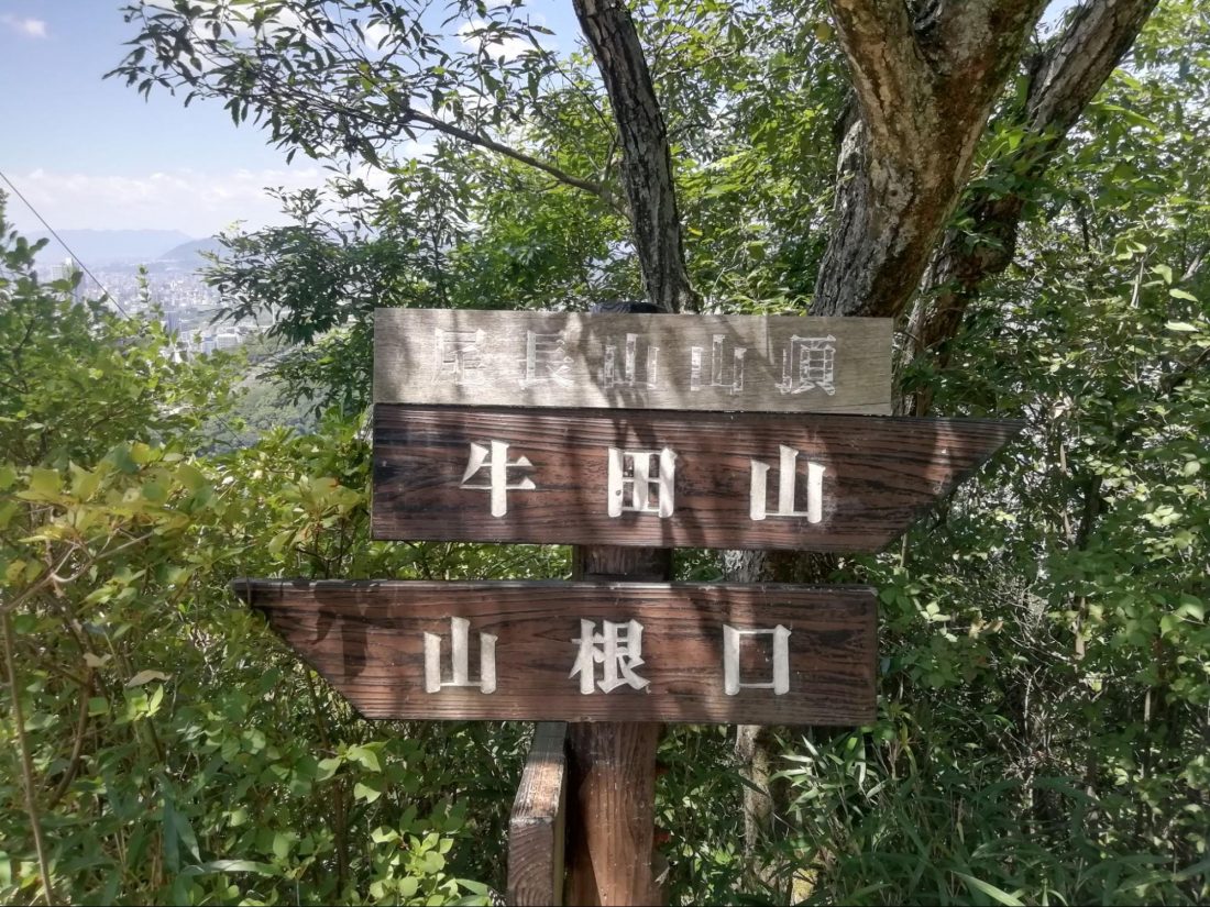 Now, the true start to your hike begins after the tower, and this is the most confusing and difficult part of the journey. The signboard at the tower and all maps seem to imply that the trail simply continues on from the tower to the next mountain. It does not. What you need to do is begin the descent down the access road to the tower, watching for a tiny bit of asphalt that turns left, just as the main road is turning right. It’s only about a one minute walk, but it’s far enough to shake your confidence. That asphalt to the left will quickly become what seems to be the trail again, but then more confusingly become stairs down to a street of houses. Don’t be alarmed. Go down the stairs and straight up the road. As it bends to the left and climbs you’ll see a sign announcing the trailhead – but quite small and in Japanese only (see above). The actual trailhead sign is even smaller, and seems a mistake. It’ll point you to the narrowest of paths along a wall that will turn to become a scrap of path along the fence of a parking lot. Fear not. Just past the fence you’ll enter trees and suddenly find the real path and start your climb.